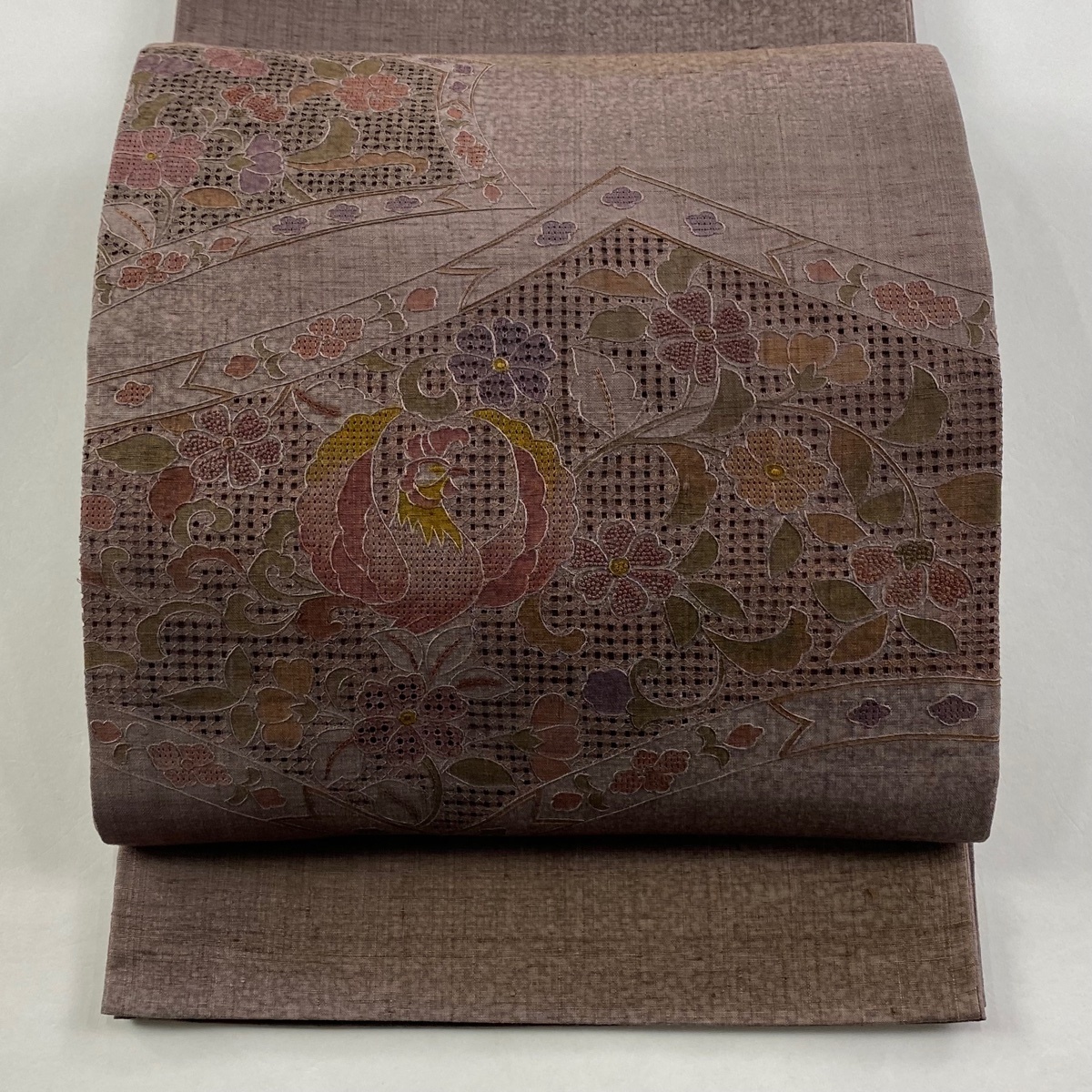 | 袋帯 秀品 紬地 鳳凰 草花 刺繍 ぼかし 灰紫 お太鼓柄 正絹 【中古】 |