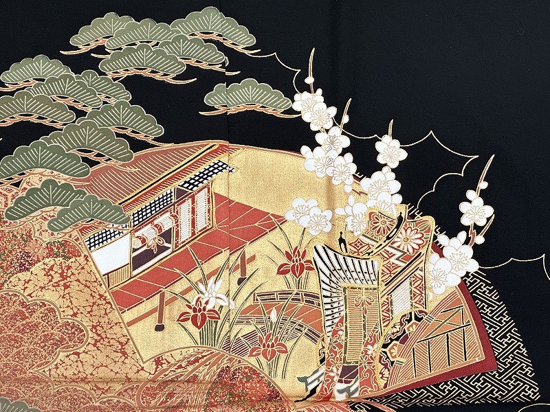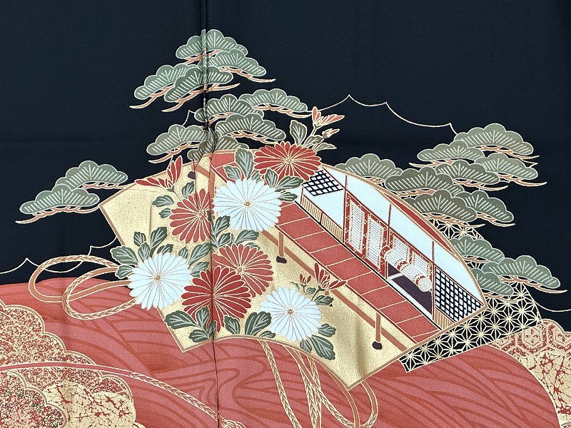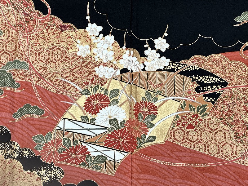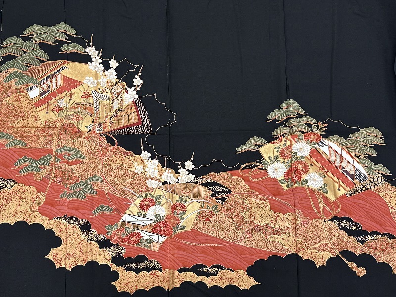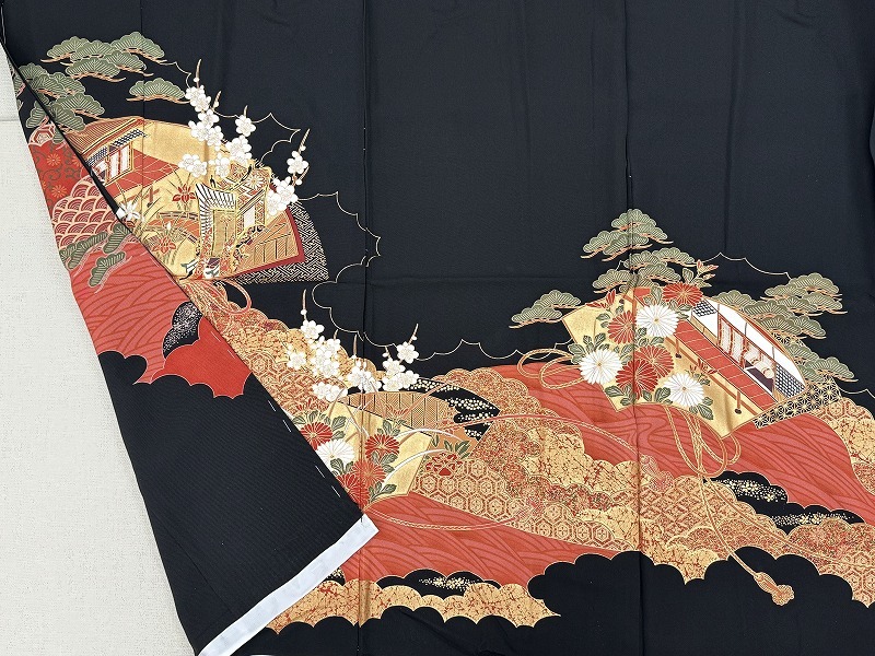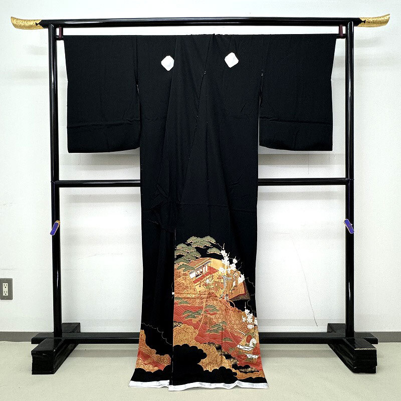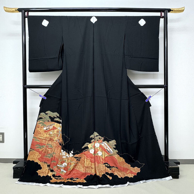 ◆黒留袖/駒取り刺繍/箔/扇面に御所車等/新品/未仕立て/正絹/絵羽/(梱包サイズ:80)◆* コメント・全体的に薄汚れ・薄い色ヤケがあります。 ・新品ですが、経年保存されていたお品ですので、ご理解のある方のご入札をお願い致します。 ・絵羽(仮縫い状態)ですので、着用にはお仕立てが必要です。当店でもお仕立てを受け賜わっております。お仕立て代は下記の「お仕立て価格表」をご参考ください。 ・ ・ * 品質・サイズ -- 着物サイズ目安 -- ・身丈・約169cm、袖丈・約58cm、裄・約67cm ・五つ紋:石持ち ・ ・※一部商品のみのお取引はお断り致しております。入札前・落札後に一部の商品のみのお取引交渉や発送方法(メール便等利用)の交渉はご遠慮下さい。サイズ・発送詳細を必ずご確認のうえ、ご理解・ご納得のうえでのご入札をお願い致します。 ・梱包サイズ:80サイズ(発送詳細必読) * 程度 当社基準ランク・・・【4】