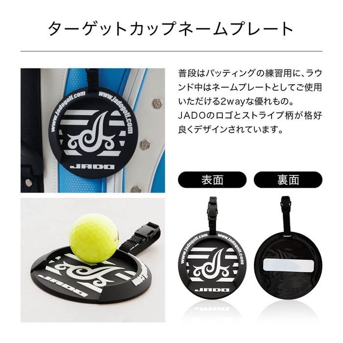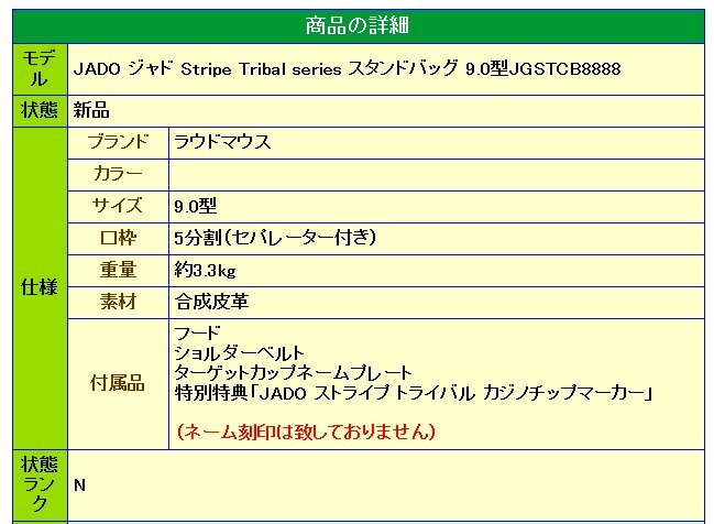 程度等 | JADOストライプトライバルシリーズ100本数量限定モデル。 男女兼用(ユニセックス)で老若男女問わず使いやすく、合成皮革による重厚感は、あなたの所有欲を満たしてくれます。 フード、ショルダーベルト、ターゲットカップネームプレート付き、前ポケット両サイド小物入れネットポケット搭載で、ネームプレートはパッティング練習にも使える機能美を追及。 当店でお買い上げ頂いたお客様には同シリーズのカジノチップ型マーカーもお付けいたします。(カラーはキャディバッグのカラーと同じカラーが付属します。) |