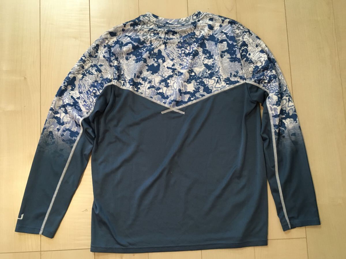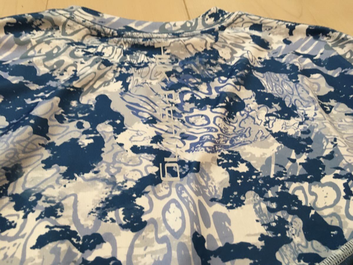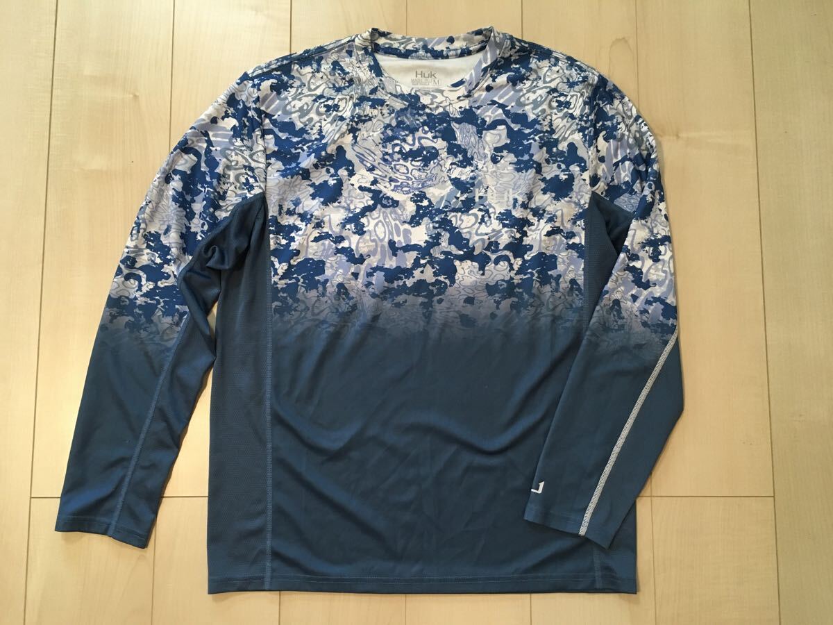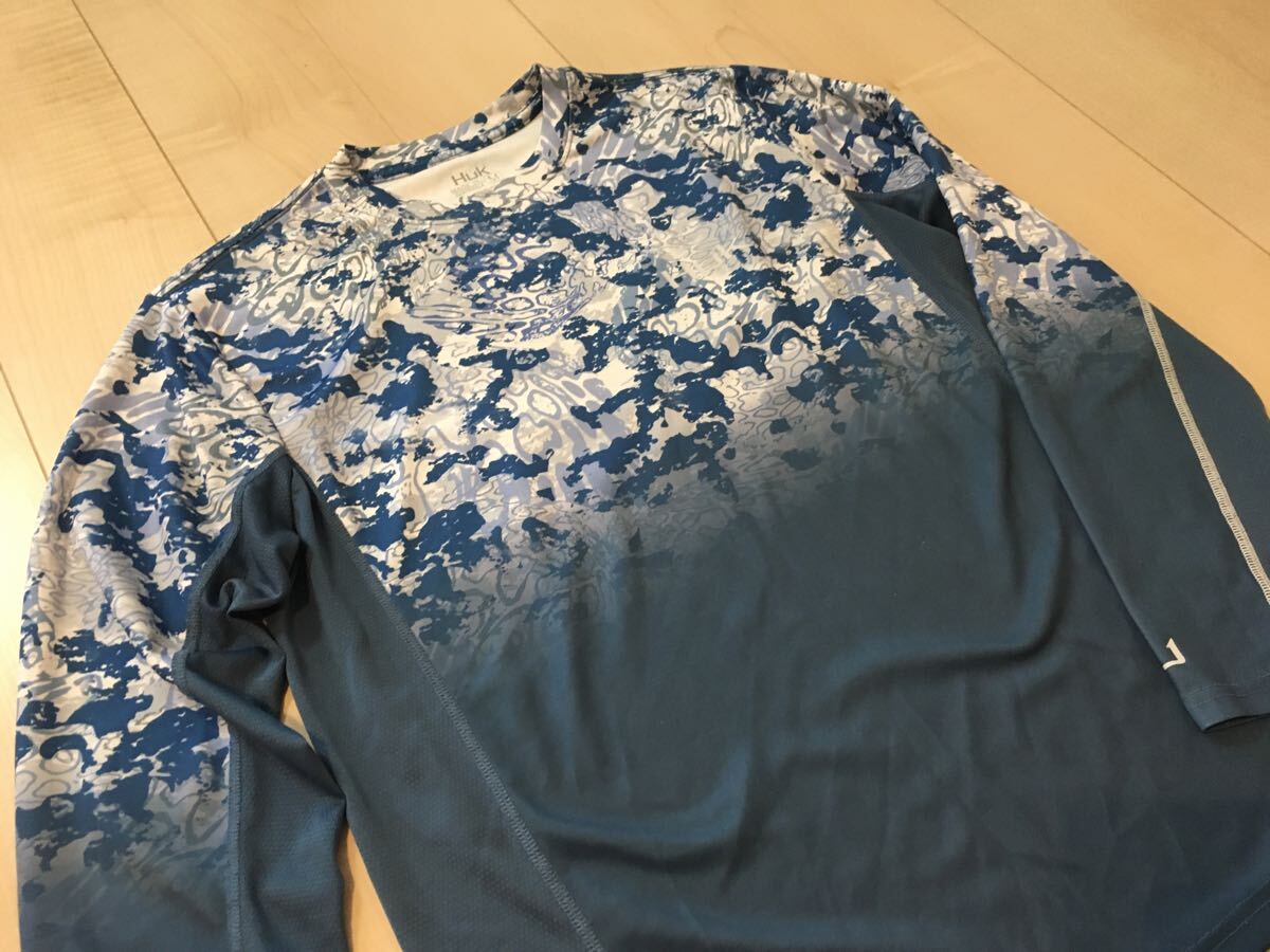 アメリカの釣りのアングラーに人気のHuk Fishingのロングスリーブシャツです。デザインは藍色に近いブルーのカモフラージュ柄です。左胸と背中と袖にロゴがあります。サラサラした生地と速乾性に優れていて、汗や雨で濡れた後にもすぐに乾き、通気性も良いので暑いシーズンの釣りに良いと思います。