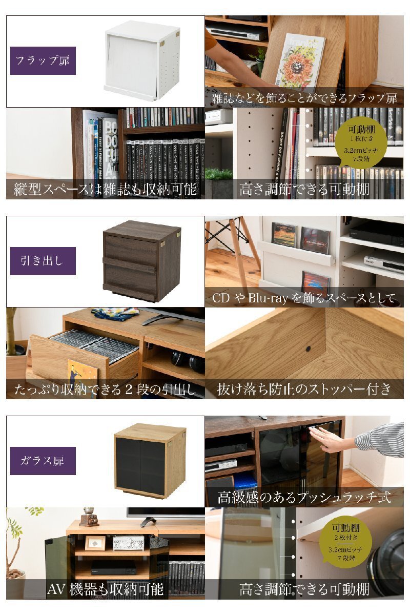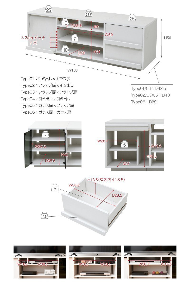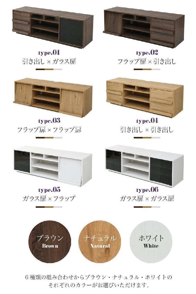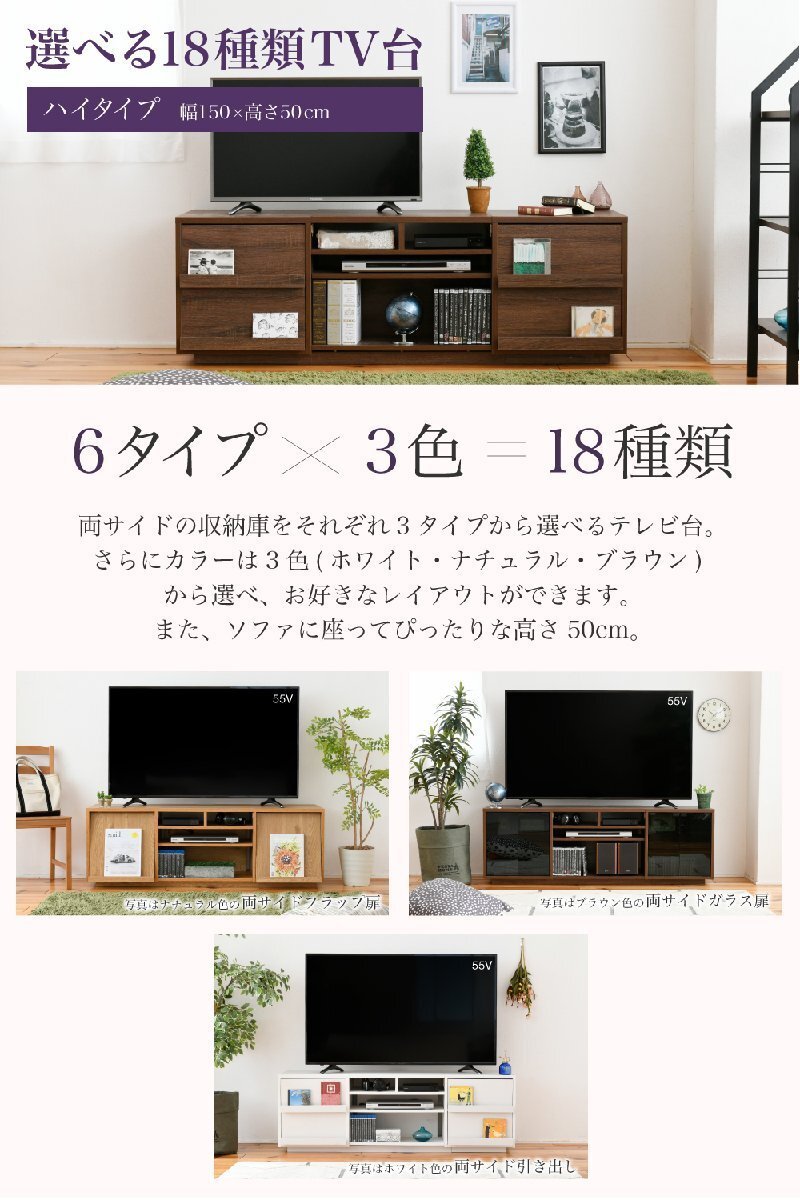 | ■商品説明 左右の収納は引き出し、フラップ扉、ガラス扉の3種類からお好きな組み合わせを選んでいただけます。大型テレビを置いても雑貨をディスプレイしても使える幅150cmのワイドデザイン。ソファやイスに座って観るのに最適なハイタイプ設計。 |