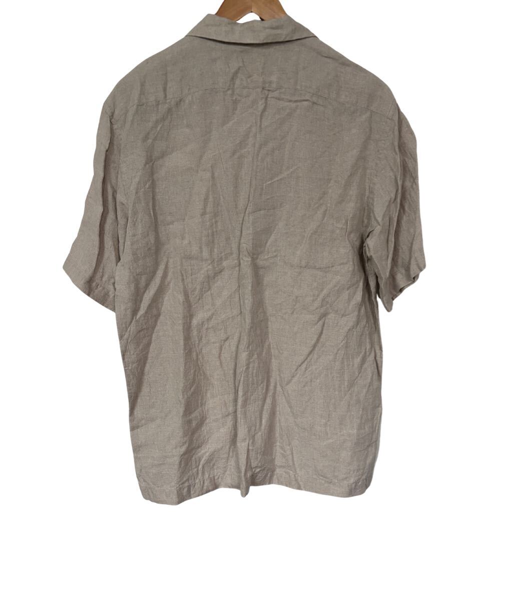 The beige color provides a soft, versatile look, while the natural wrinkles characteristic of linen add a relaxed, effortless charm. Its simple yet elegant design reflects a sophisticated casual style, making it suitable for a wide range of occasions. Featuring a button-up front and a chest pocket, it balances both resort-inspired ease and polished refinement.