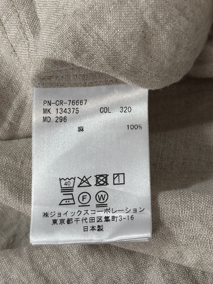 カラーはベージュ系で、柔らかな印象を与えつつ、リネン特有のシワ感がリラックスした雰囲気を演出。シンプルながらも大人の余裕を感じさせるデザインで、オンオフ問わず幅広く活躍します。フロントはボタン仕様で、左胸にはポケットを配置。リゾート感と上品さを併せ持つ仕立てとなっています。
