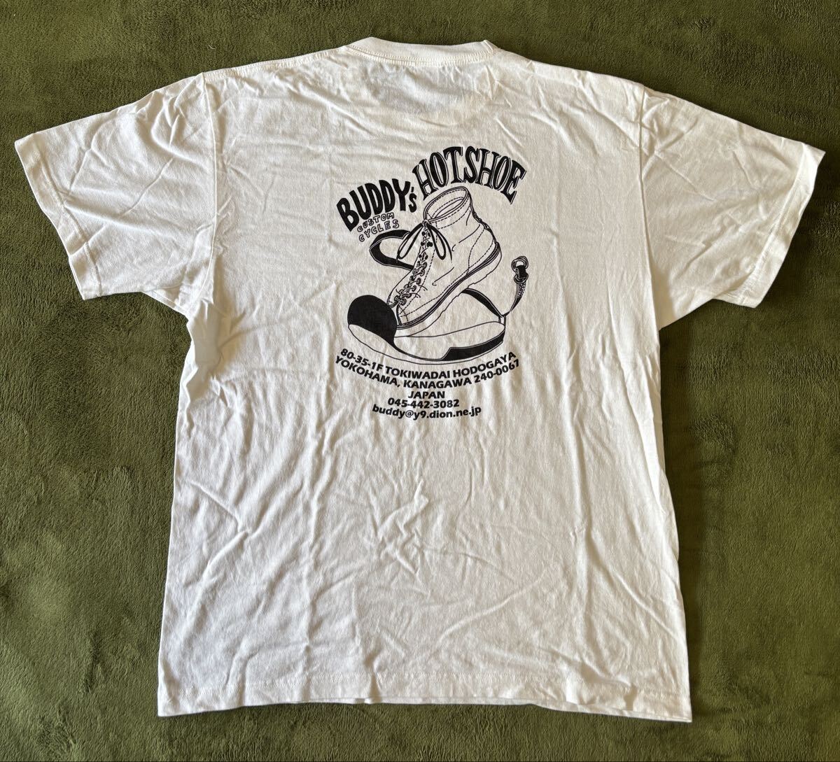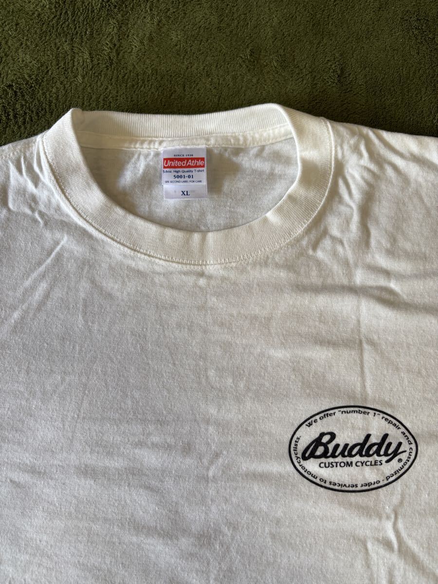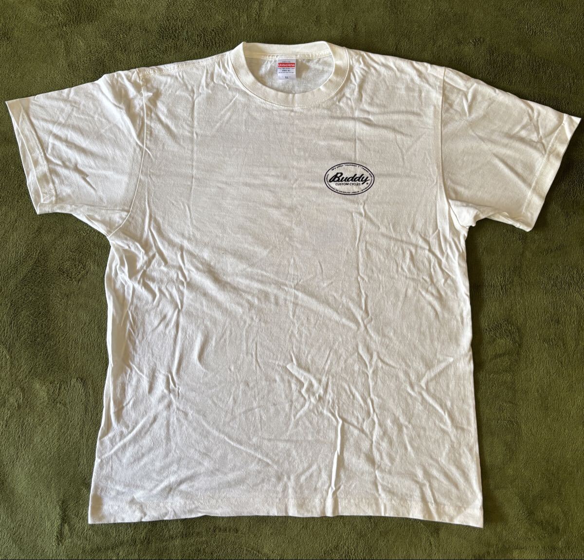 Buddy Custom CyclesのXLサイズTシャツ、バックプリント付き。
