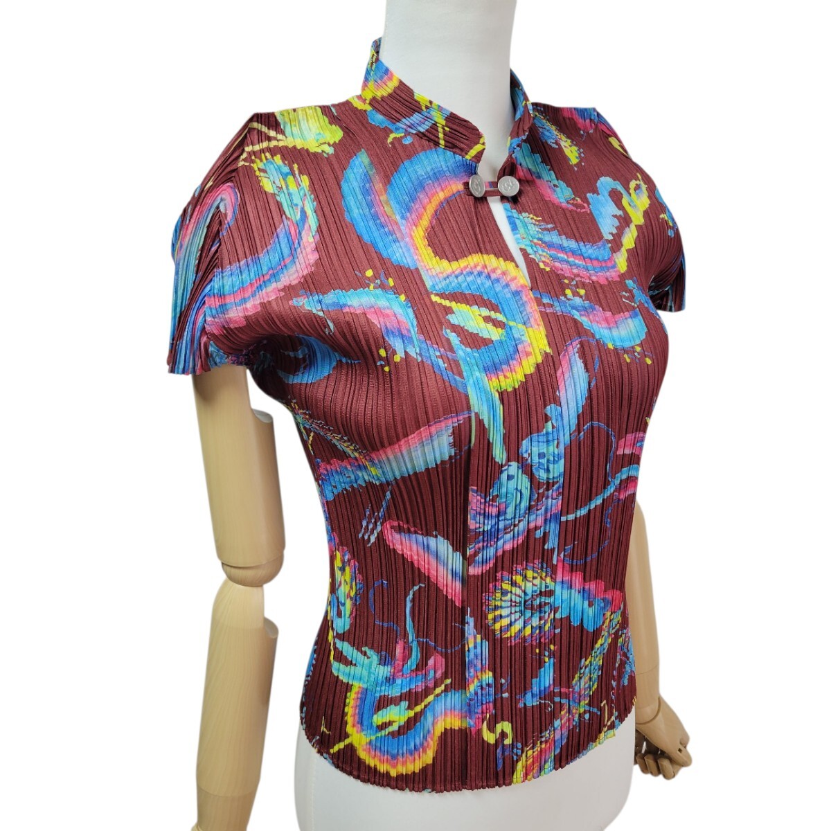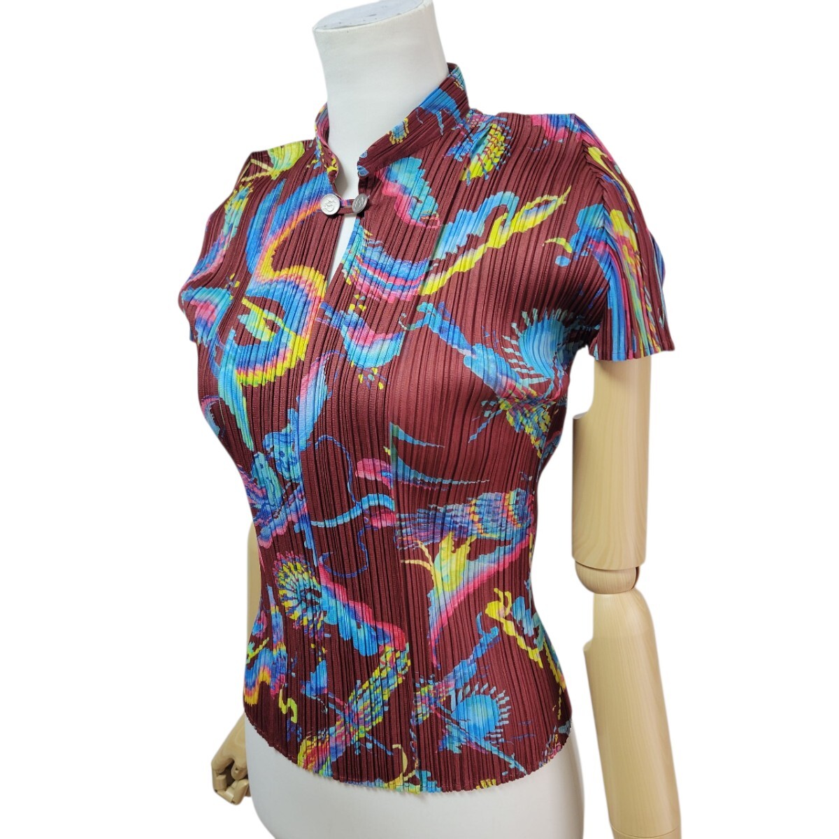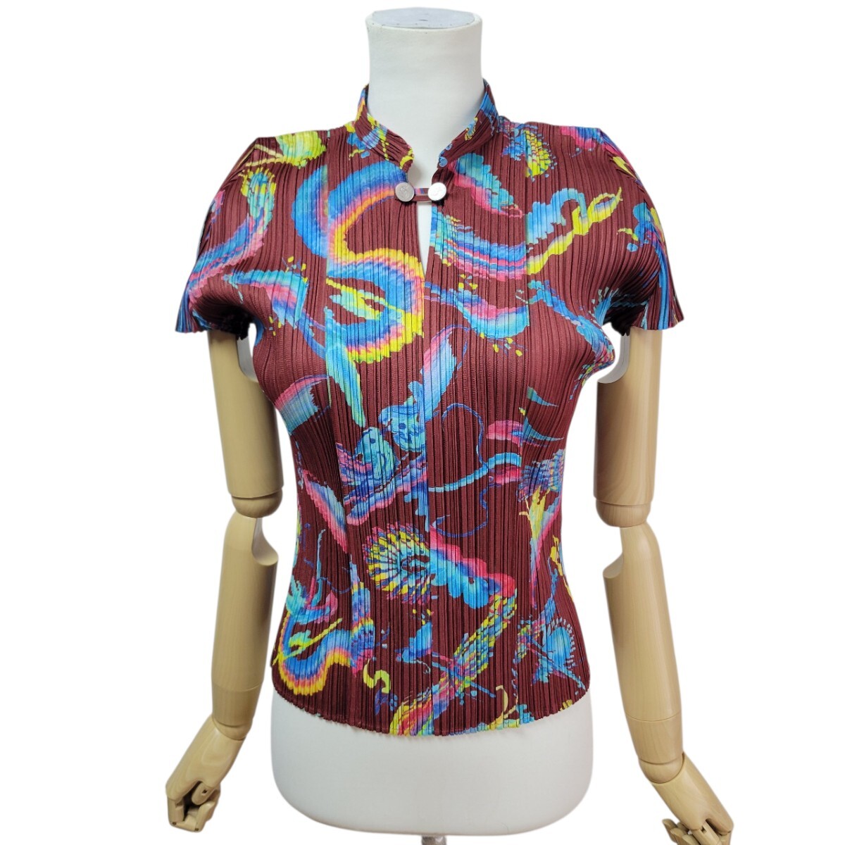 プリーツプリーズ イッセイミヤケ 幻獣 総柄 龍 チャイナボタン カットソー 半袖トップス ブラウス PP63-JK632