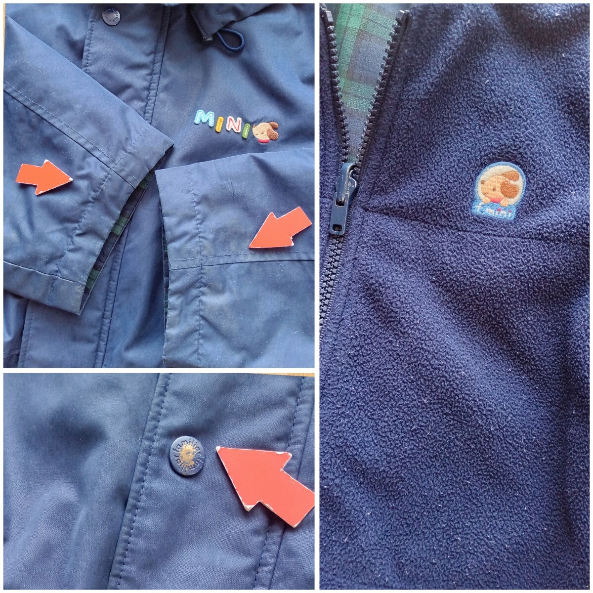やや着用感と、ジャンパーボタン金具に剥げと汚れ所々有、チャック金具一部紛失、フリース全体に毛玉有