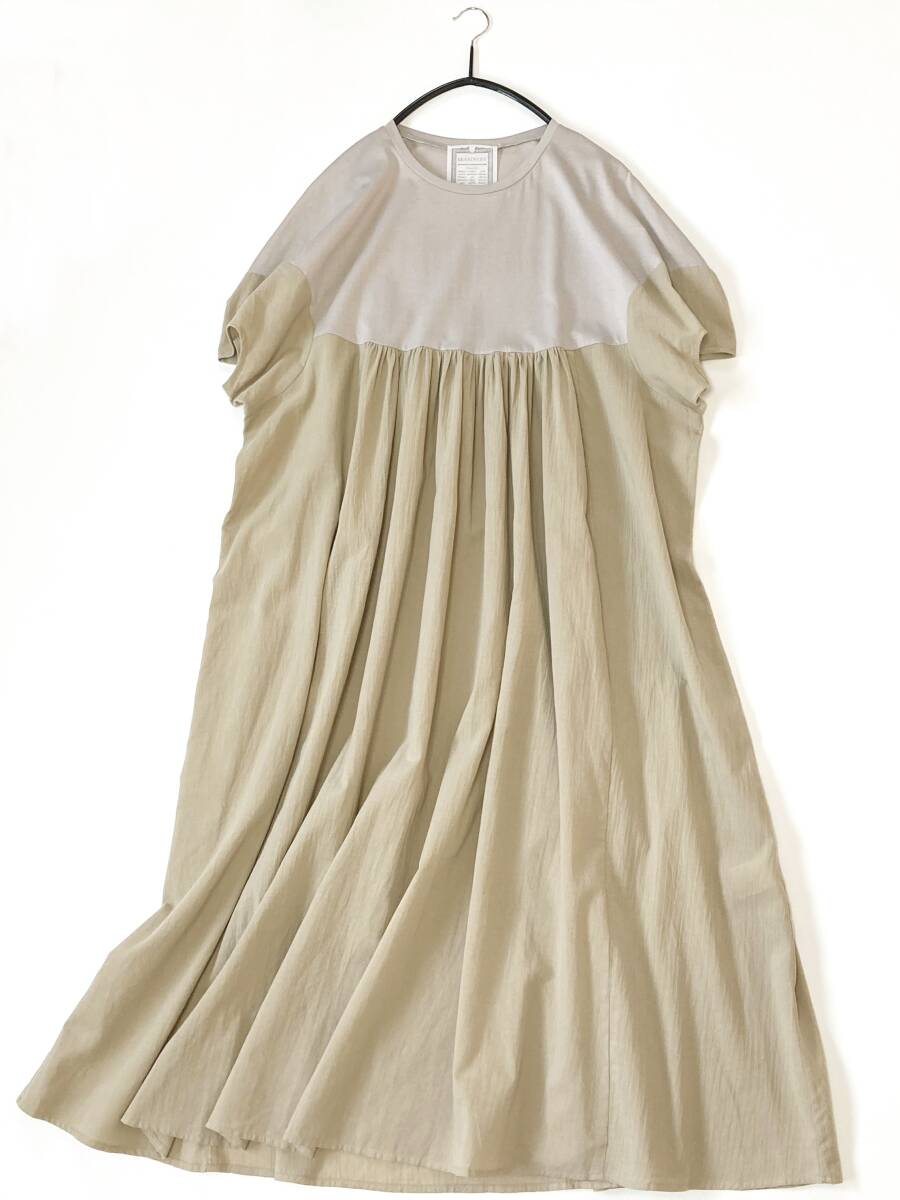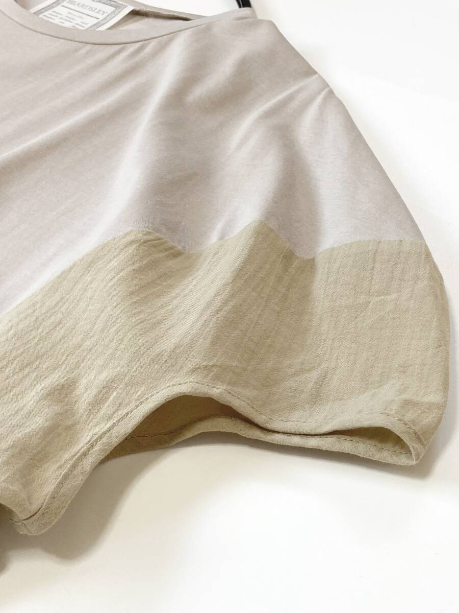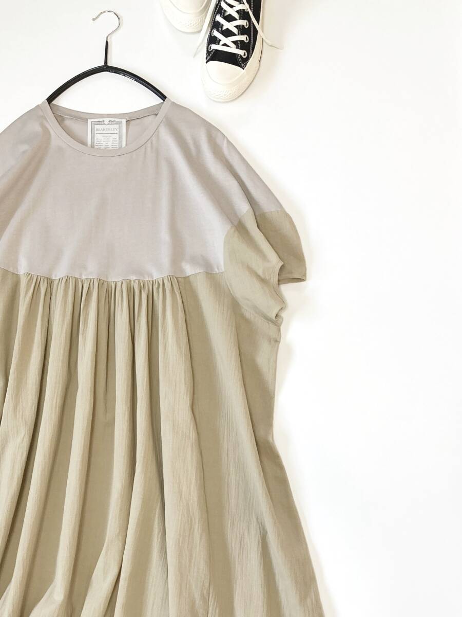 柔らかな風合いの布帛とカットソーを組み合わせた異素材の切替デザインは、1枚でサマになるひと品◎