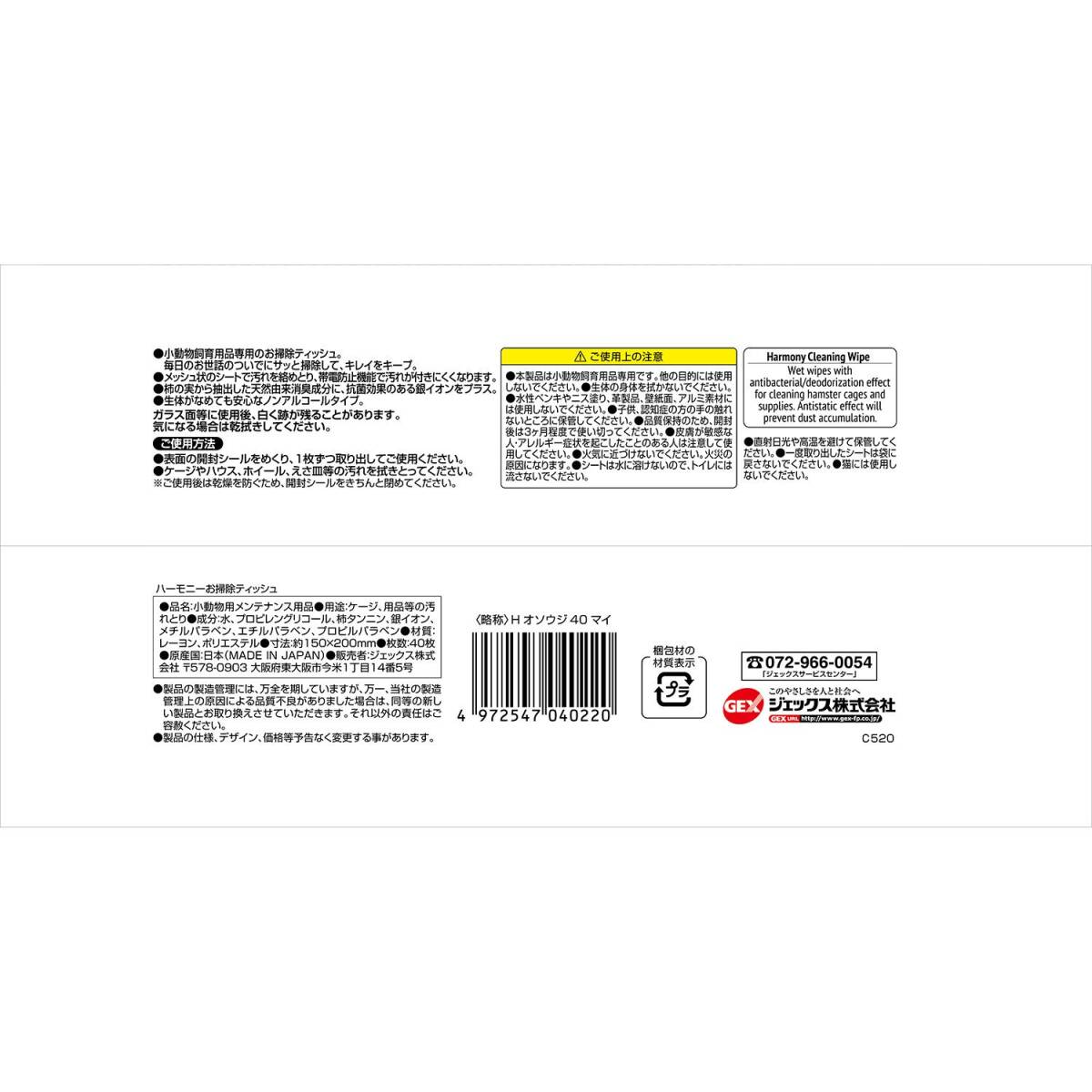 GEXジェックス Harmony ハーモニーお掃除ティッシュ 消臭・抗菌+帯電防止成分配合 ハムスター・小動物用 40枚入