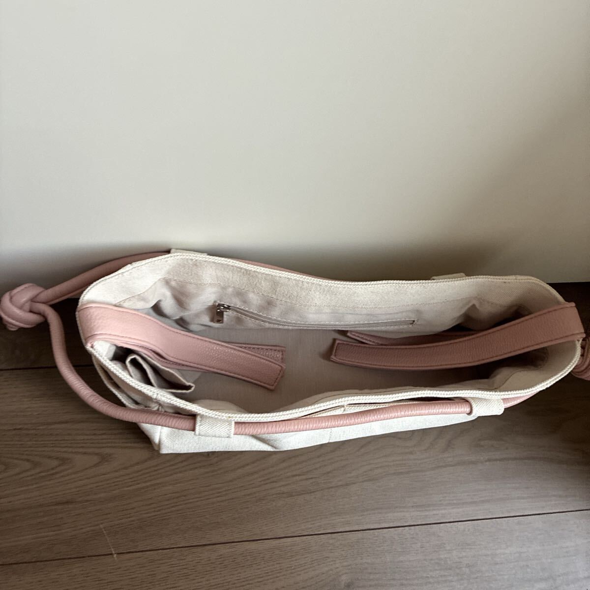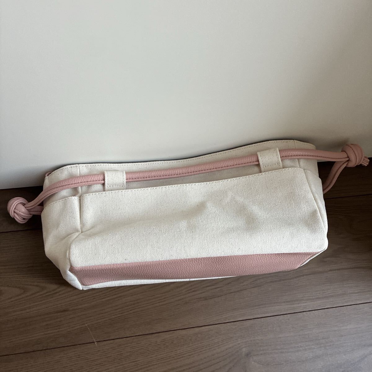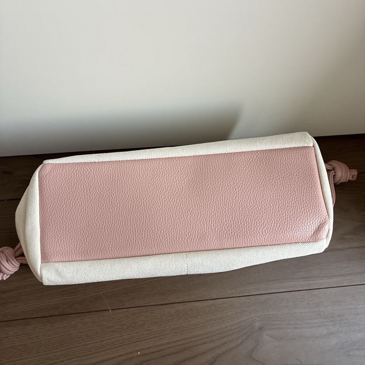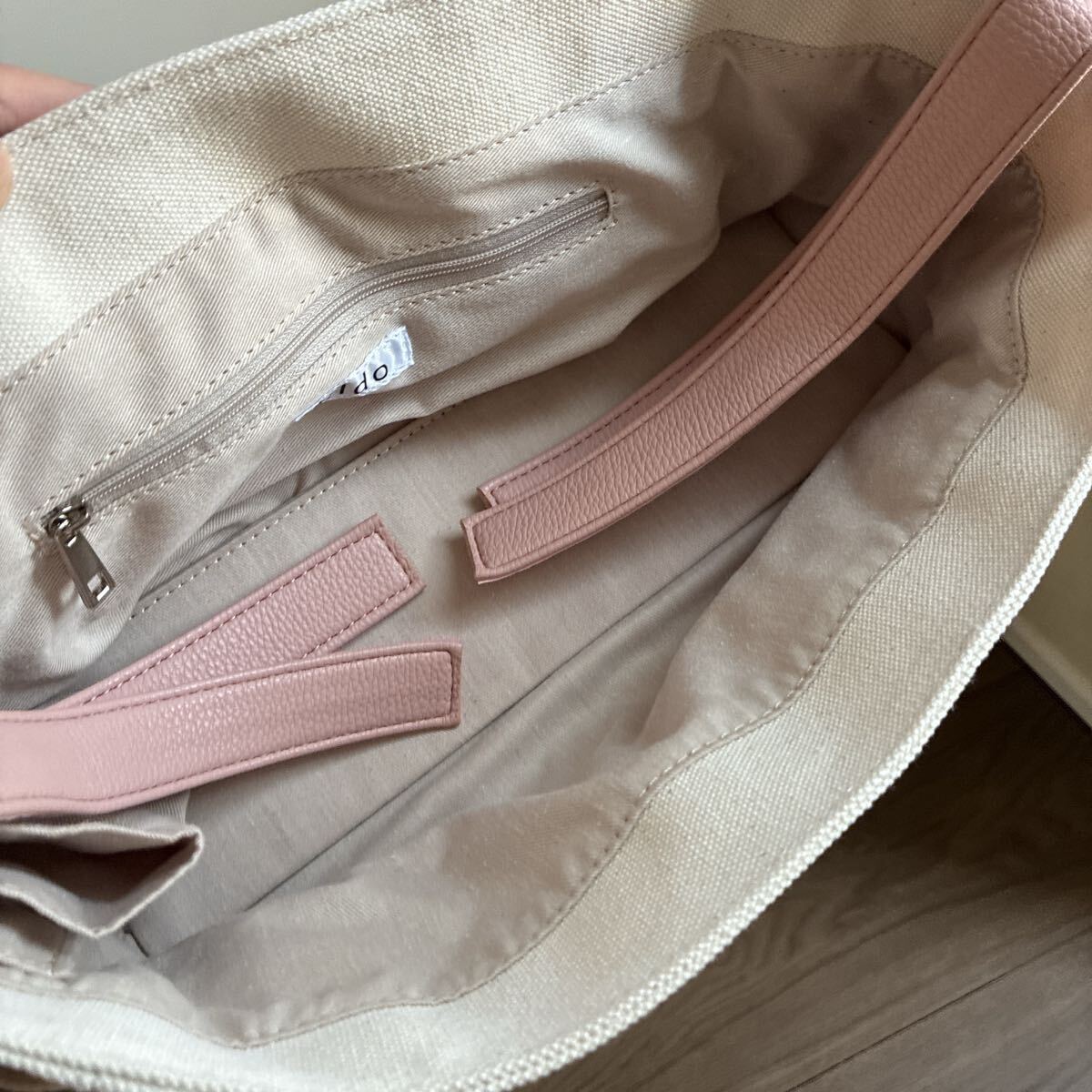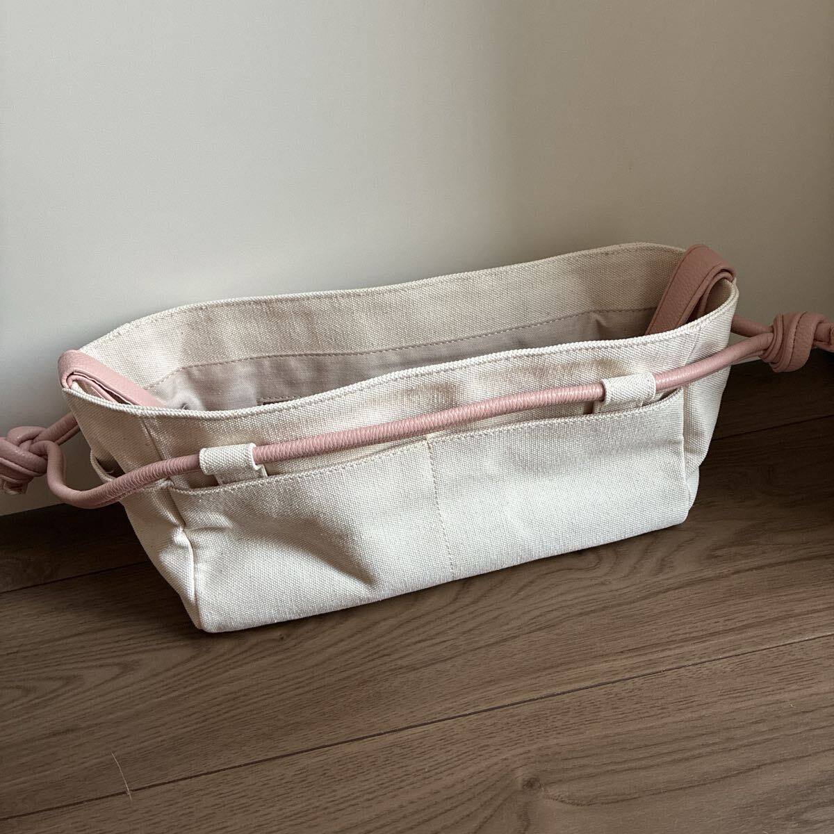 シンプルで洗練されたベージュのキャンバス素材が特徴のバッグです。柔らかいピンクのハンドルがアクセントとなり、スタイリッシュな印象を与えます。