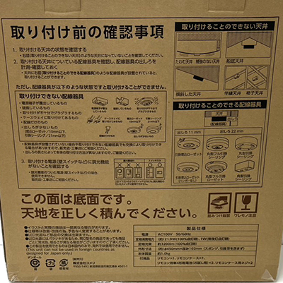 | その他 商品情報 | ■商品仕様 適用畳数:〜6畳 光源:LED テイスト:洋風 定格光束:3200ルーメン リモコン:付属 光色:昼光色 消費電力:22w 単品サイズ:約直径450×奥行102mm 重量:1kg ※詳細につきましてはメーカーホームページをご確認下さい。 |
