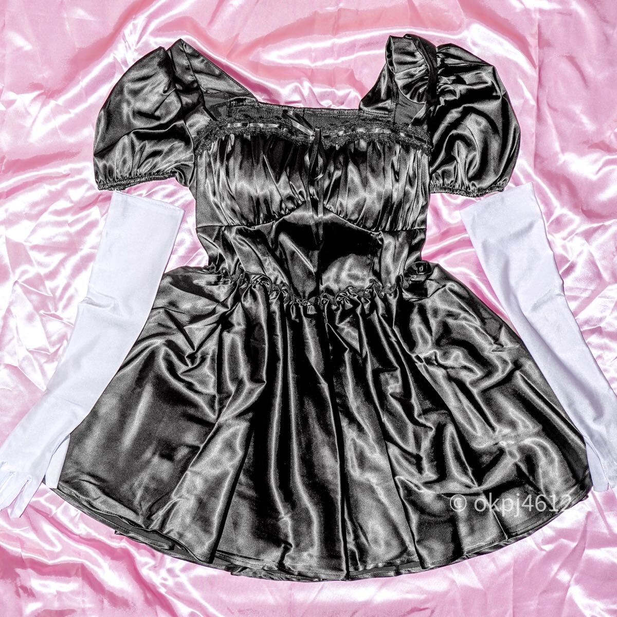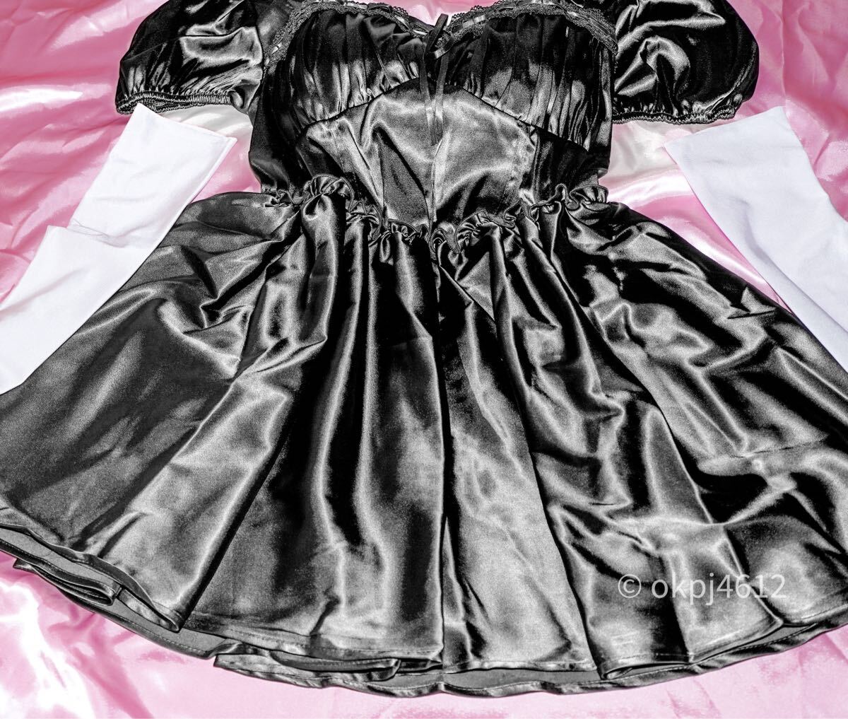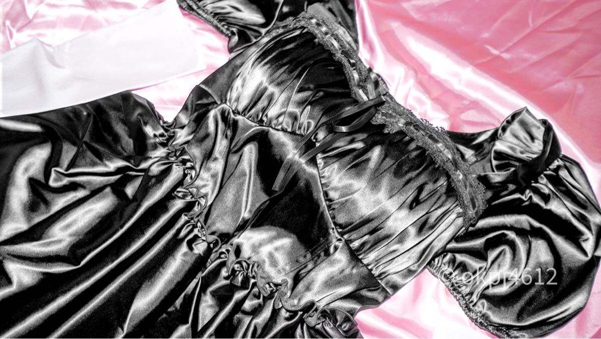 超光沢の誘惑的なメイド服風のとろとろサテンドレスです。