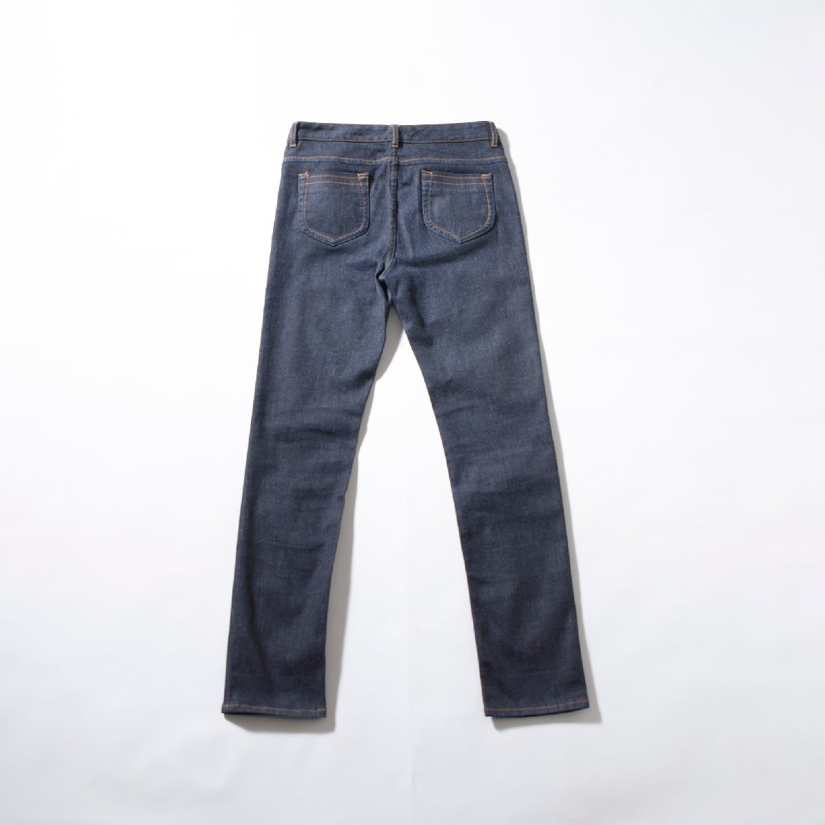 5ポケットデザインとボタンフライ仕様で、ベーシックながらも洗練された雰囲気を漂わせます。