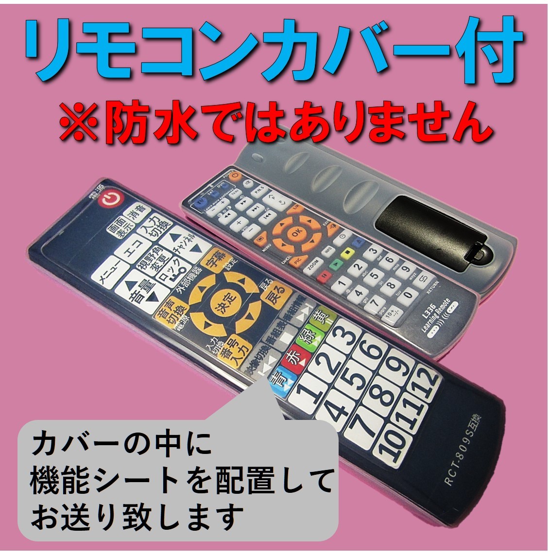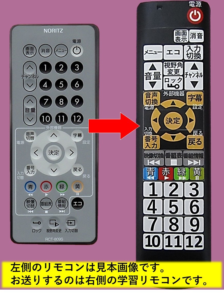 【発送について】速やかな発送を心掛けておりますが、発送ができない日もありますので、出荷日情報を必ずご確認ください。 ↓↓リンクを確認↓↓ 最新の出荷日情報(自己紹介コメント欄) ↑↑リンクを確認↑↑ ・日時指定「*月*日着」や「*日まで必着」等はお受けできません。 ・自己紹介ページ記載の予定で出荷しますが、天候・交通状況等の事情で到達が遅れる場合もあります。急用の場合は入札をお控えください。 -------------------------- [送料無料] ・郵便受けに投函となります。到着日時の指定はできません。 ・プチプチ簡易包装の上、クラフト封筒の発送となります。 -------------------------- 【品名】NORITZ RCT-809S 互換 学習リモコン ※防水リモコンではありません! -------------------------- 【対応機種】YTVD-1203W-RC ・上記型番以外につきましては、質問欄よりコメントいただければ、対応リモコンを別途ご案内致します。 -------------------------- 【製品詳細】 ・学習リモコンに上記対応機種の信号を学習させました。 ・信号プログラム済なので、電池をお入れいただければ、すぐにお使いいただけます。また電池交換をしても学習内容が消えてしまうことはございません。 ・ボタン機能を印字したラベルシートをカバーの内側に配置しております。 ・お送りするのは、右側の学習リモコンとなります。左側のリモコンは見本画像となります。 ・リモコン本体のみとなります。乾電池は付属しませんので、別途ご用意ください。(単4乾電池×2本) ・付属のリモコンカバーは、信号発光部と電池ボックスが空いているので、完全防水ではございません。入浴中や湿気の多い環境では基本的にお使いいただけませんのでご注意ください。 -------------------------- 【手渡し不可】お近くでも商品の手渡しは行っておりません。 -------------------------- 【評価について】評価不要のご依頼が多いので、間違いを防止するため、発送時ではなく後日の評価とさせていただいております。 ・評価ご希望の方→評価を入れてください。後日こちらからもお入れ致します。 ・評価不要の方→評価は入れないでください。当方へ評価があるとこちらからも入ってしまいます。ご注意ください。 -------------------------- |