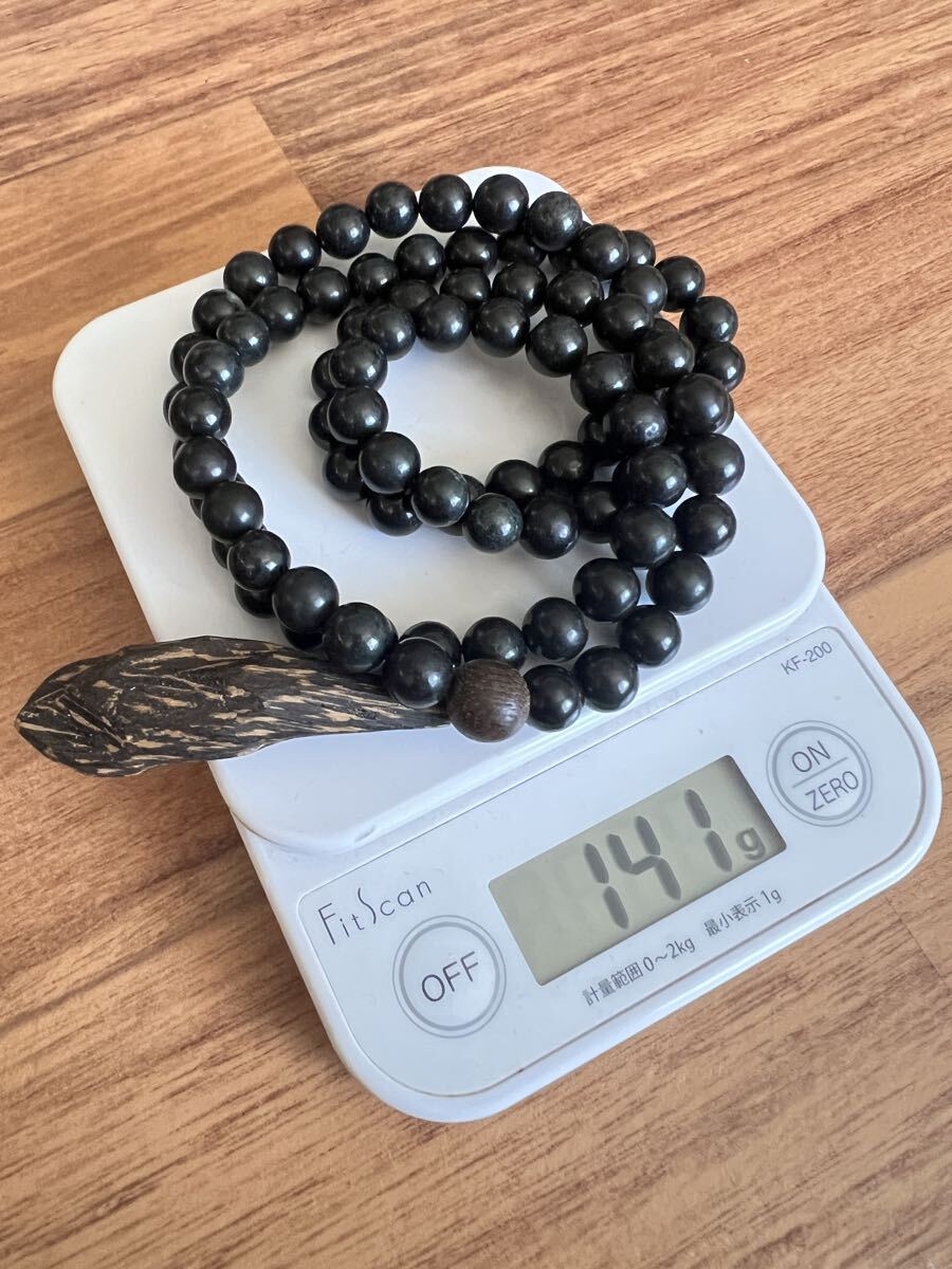伽羅沈香木と隕石数珠を使用した二重構造の数珠ネックレス。