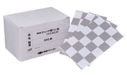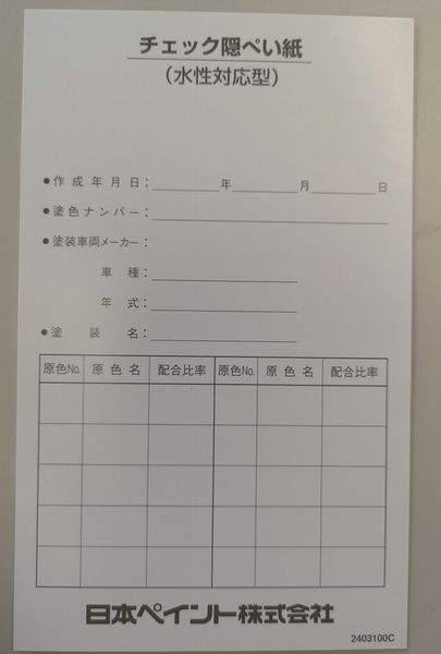| 表面にチェック模様の印刷がしてあり、スプレーを何度か重ねて、チェックの白と黒の境目が見えなくなった時点が隠ぺい膜厚になります。通常の塗色はこの段階で比色をします。 鮮やかなレッド系等、何度スプレーしても隠ぺいしない場合は下塗り用の色を塗装した隠ぺい紙をあらかじめ何枚か用意しておくと効率よく調色作業が行えます。 裏面には作成日・配合などをメモする用紙になっております。何パターンか配合の候補がある場合はメモしておくと再確認の際に安心です。 |