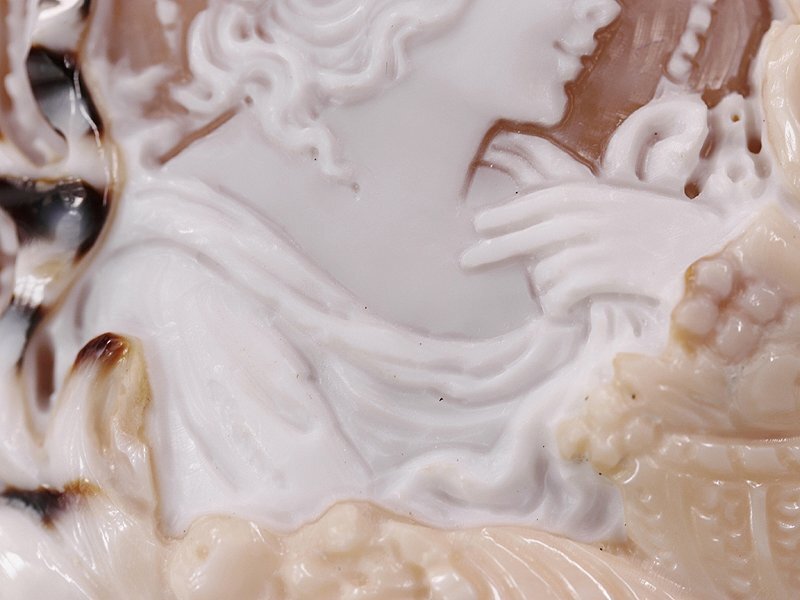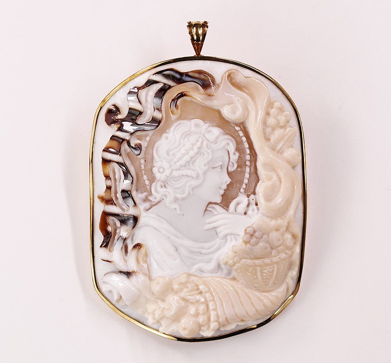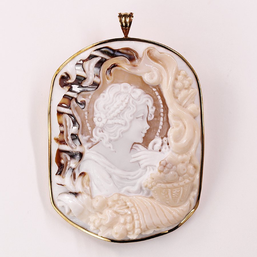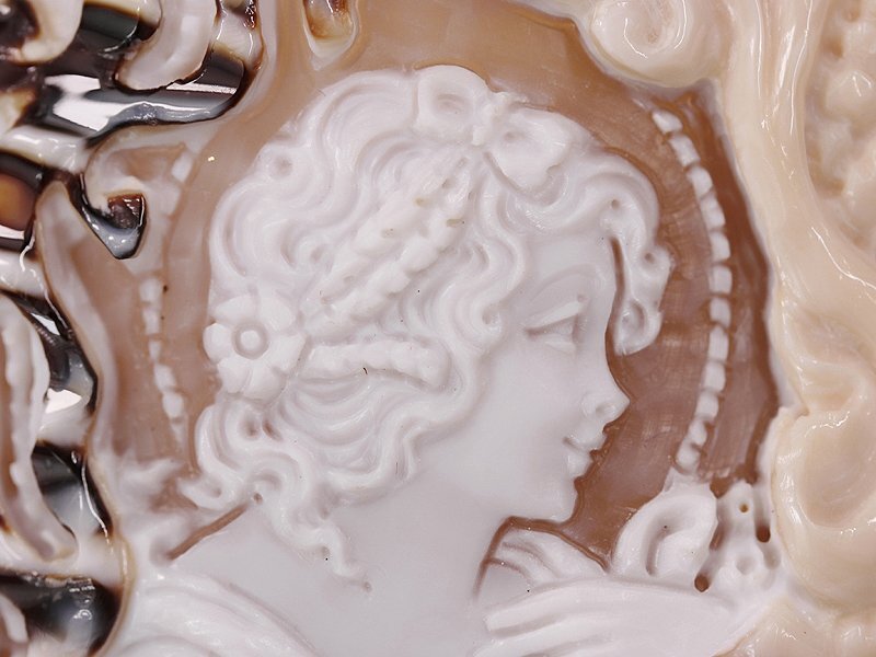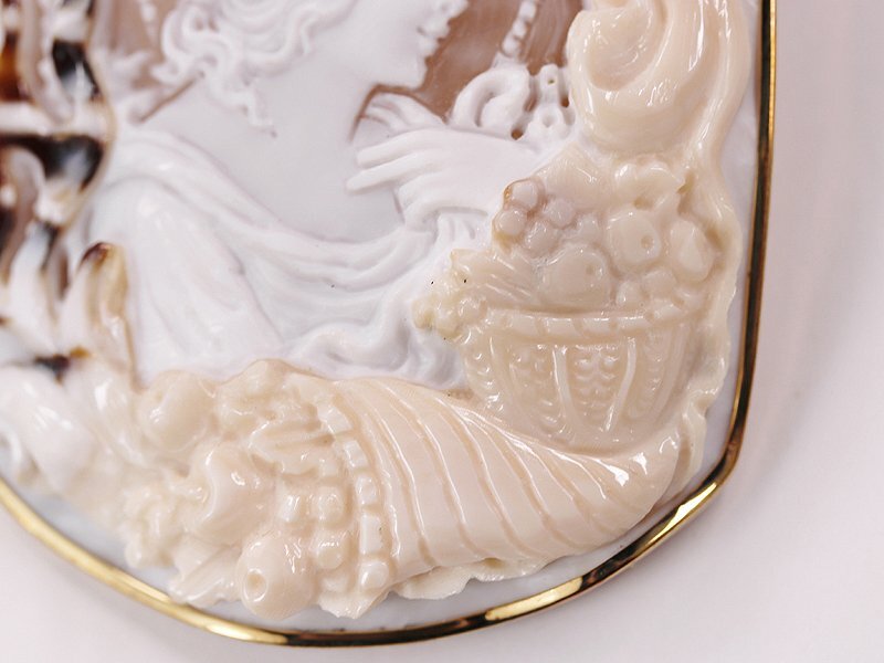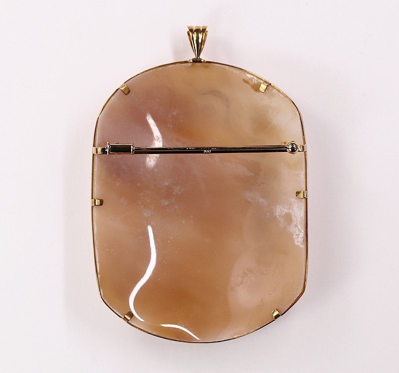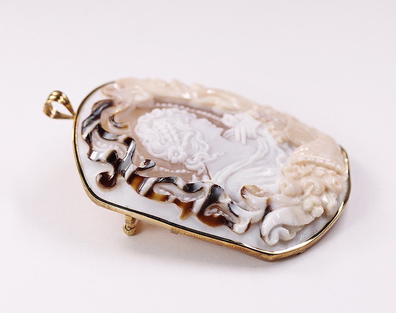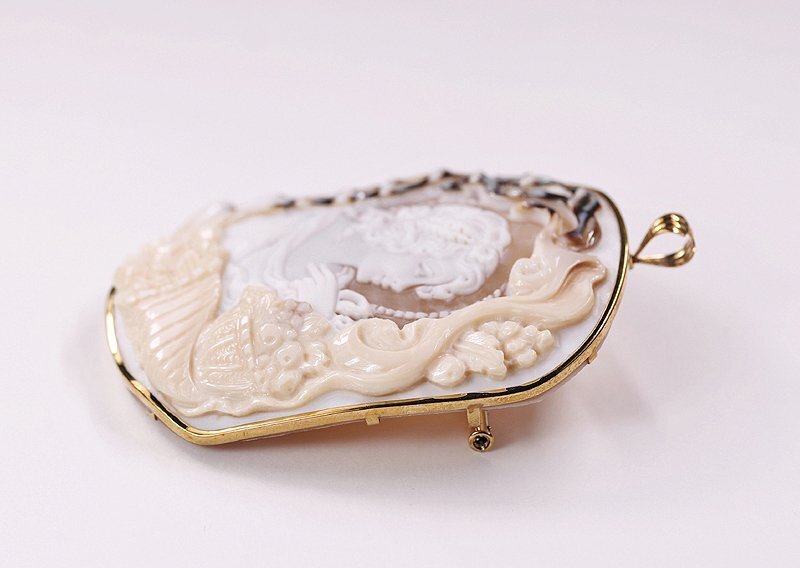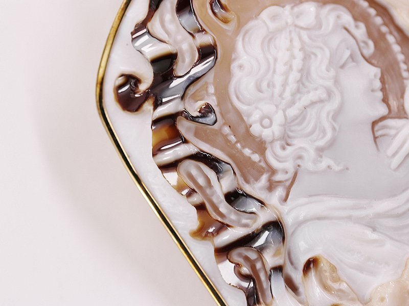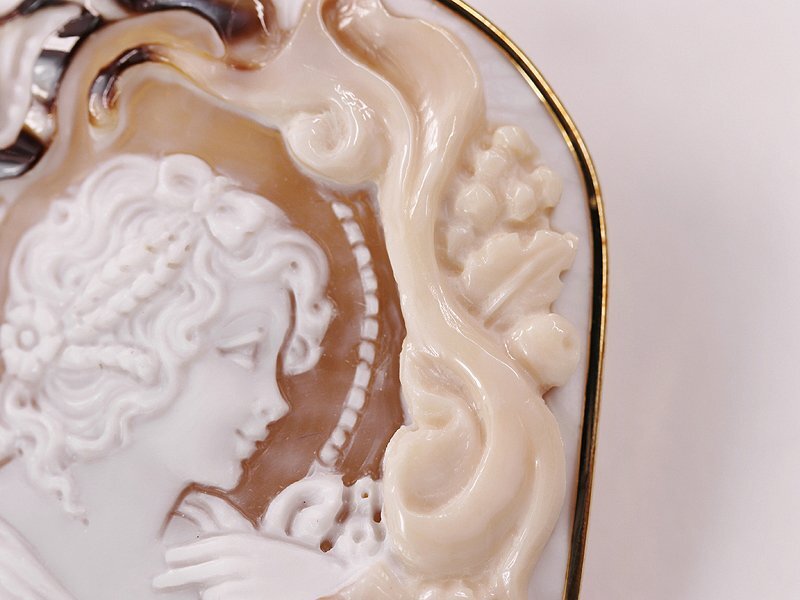 女性横顔のレリーフ彫刻されたシェルカメオ。 リング部、ピン下の水平板、ピン先留め具の側面と3つの「K18」刻印が打たれた、 |