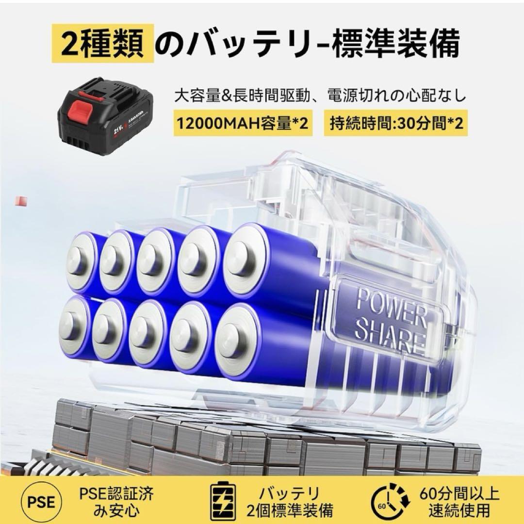 ① コードレス&充電式・マキタ互換バッテリー対応 自由な作業を可能にするコードレスタイプ。マキタ対応の10セルAグレードリチウム電池(12000mAh×2)を採用し、家庭用からプロ用途まで対応可能なパワフル設計。