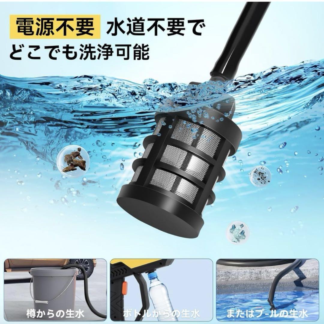 ③ 自吸式・水道不要・5m給水ホース付属 5メートルのロングホースで、バケツやペットボトルからも安定給水。水道がない場所でも、庭・屋外・災害時・キャンプなどで活躍。自吸式だから節水にもつながります。