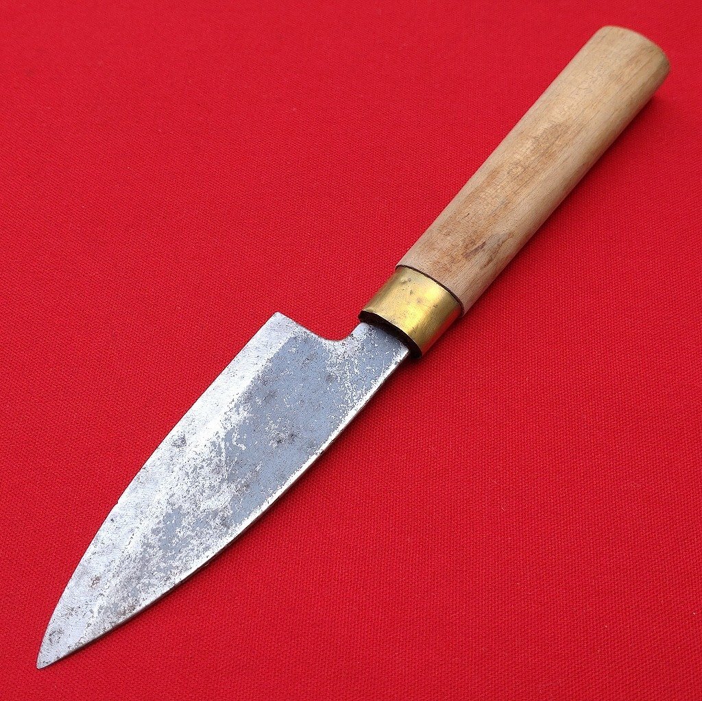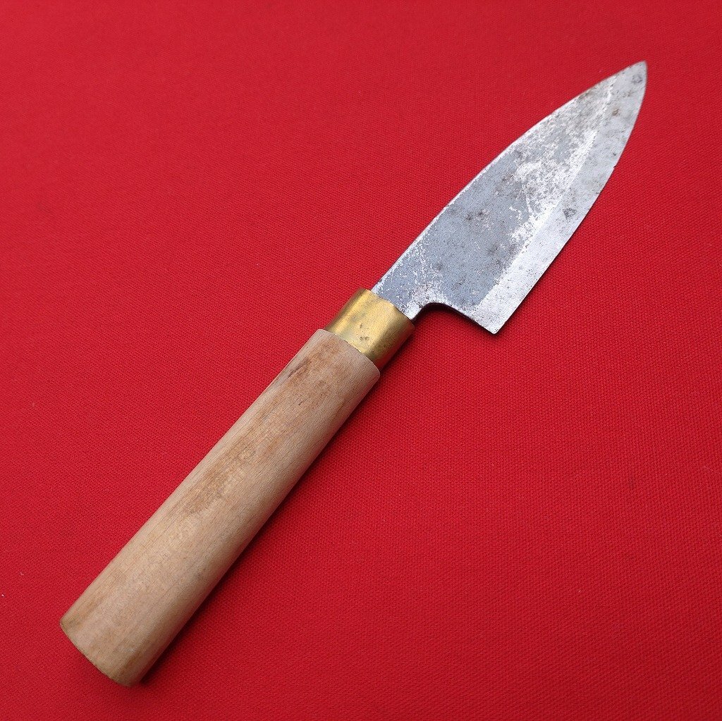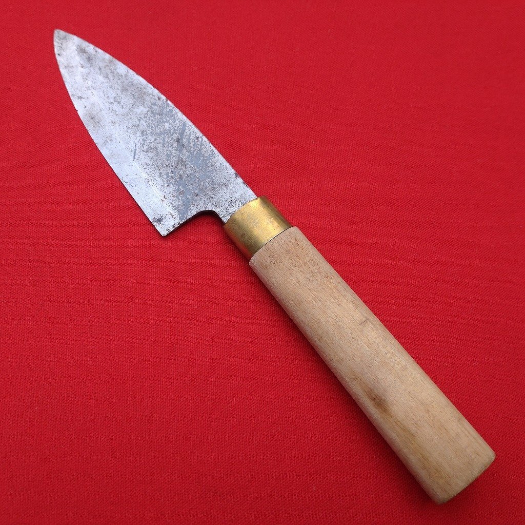 小出刃包丁 鯵切 刃長約96㎜ 峰厚約1.2㎜ 重量約55g 両刃 真鍮桂 小型包丁 庖丁 刃物 日本製  【2666】