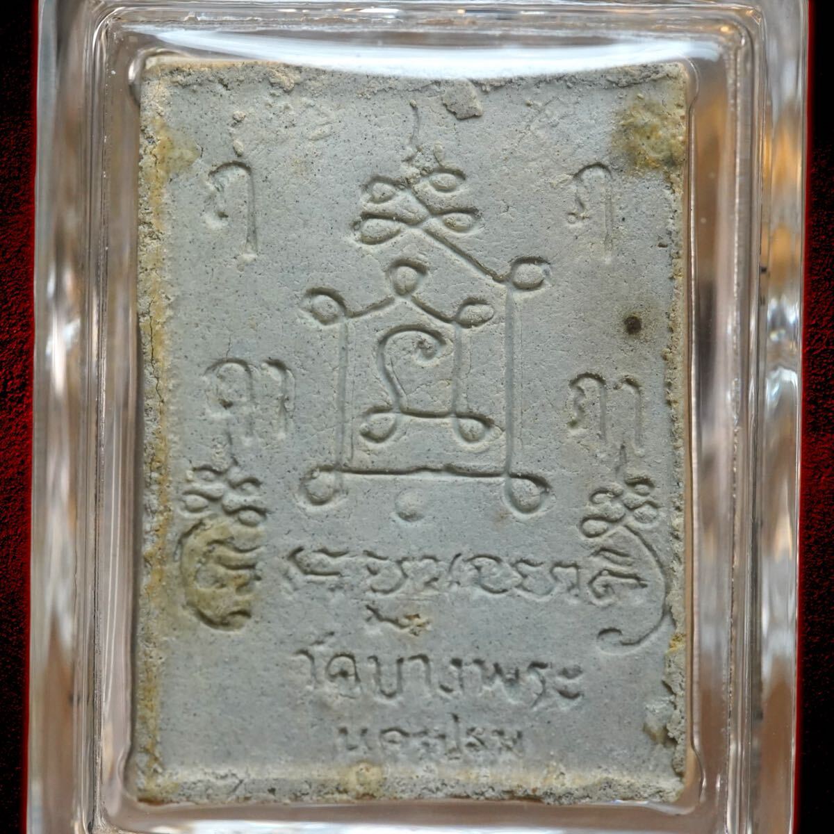 背面には「ナ」の文字を中心としたヤントが刻まれており、その多くは「ナ・モ・プッ・タ・ヤ」という仏陀五尊の真髄を示す呪文の音節で構成されています。