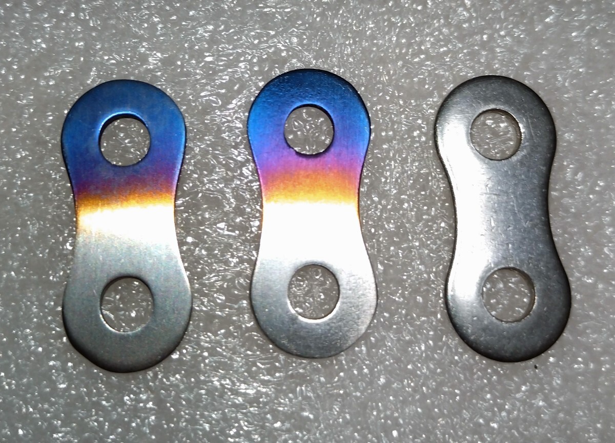チェーンプレートはカエリを除去、両面#400仕上げで研磨してから、陽極酸化加工しています。先に出品しているチタンチェーンプレートより磨きは甘めです。