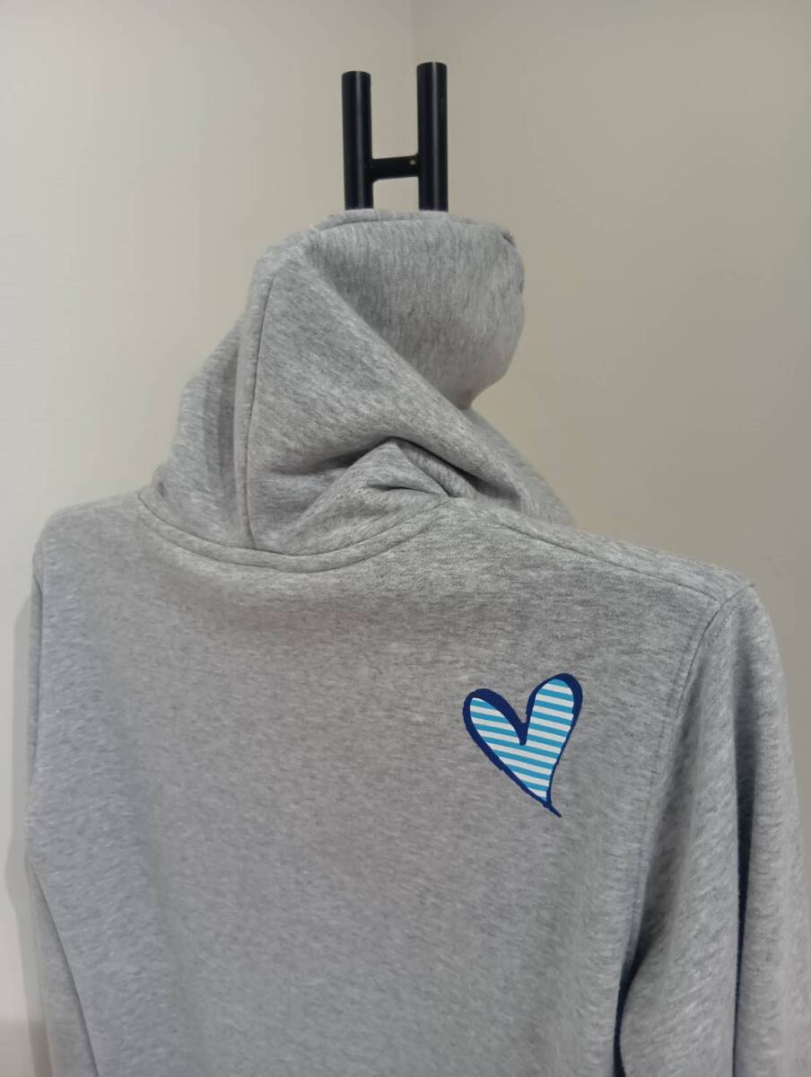 かぶるタイプのトレーナーパーカーで、グレーのスウェットです。バックプリントのハートが可愛いですね