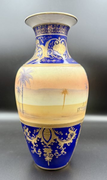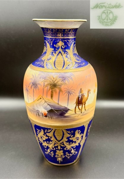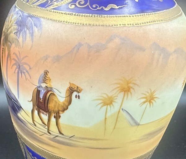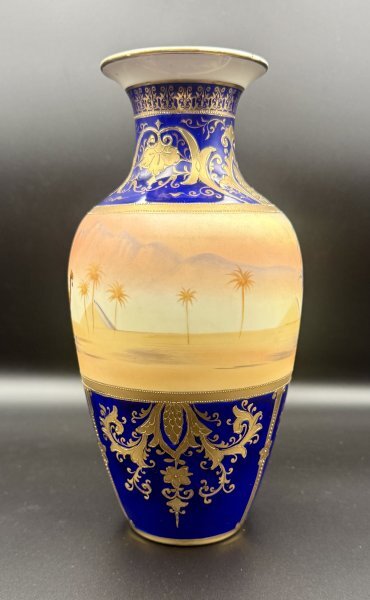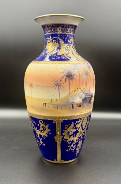 【希少】オールドノリタケ 盛上金彩 マルキ印 コバルトブルー地 キャメル砂漠風景 花瓶 里帰りアンティーク 高さ27.5cm 1920年代頃 T014
