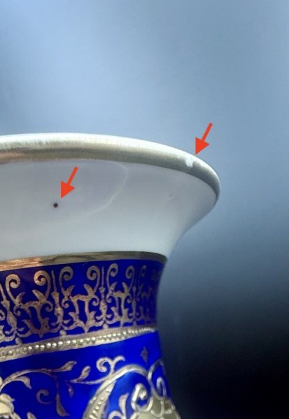 深く鮮やかなコバルトブルー地に、盛上げの金彩が豪奢に輝くオールドノリタケの花瓶です。