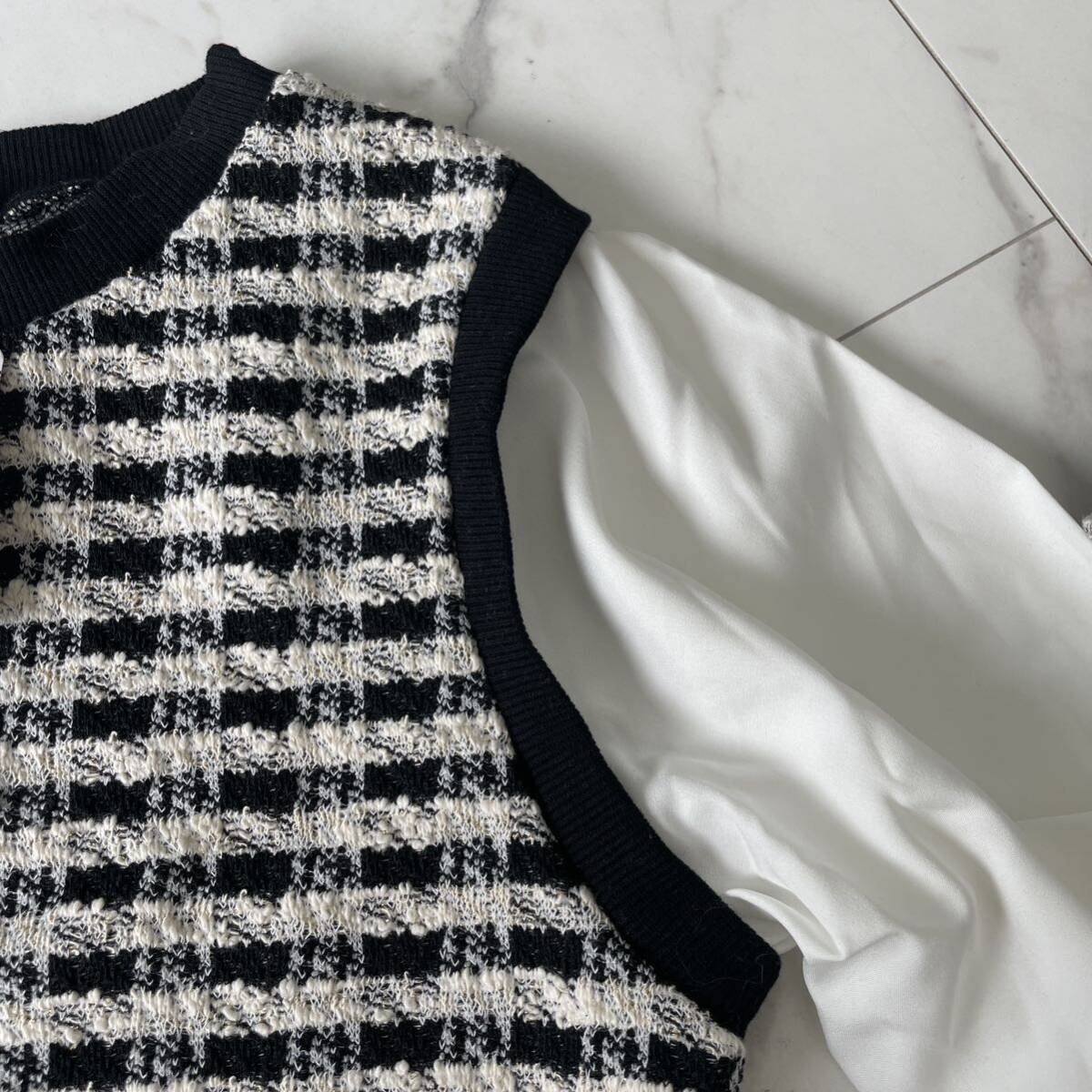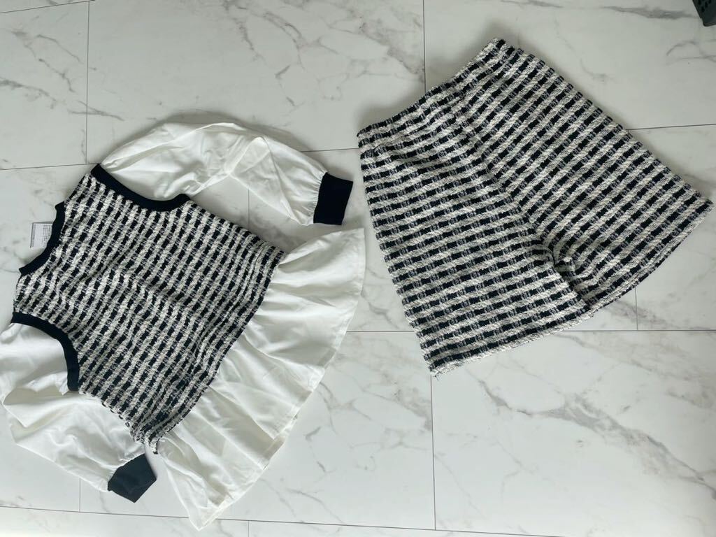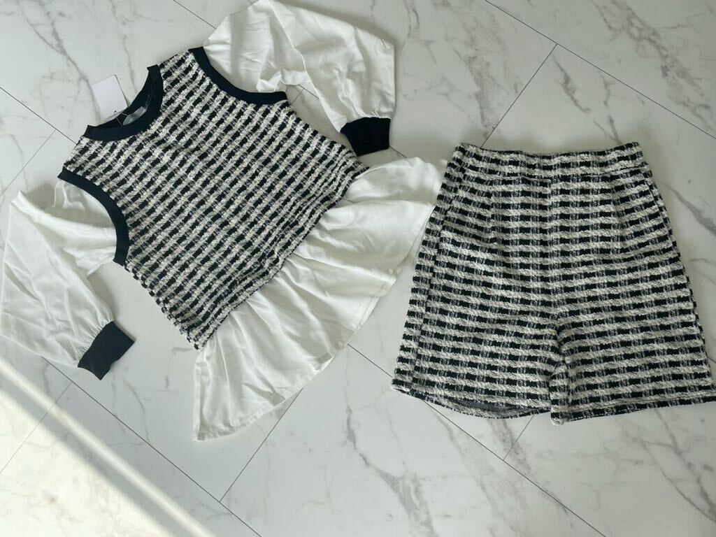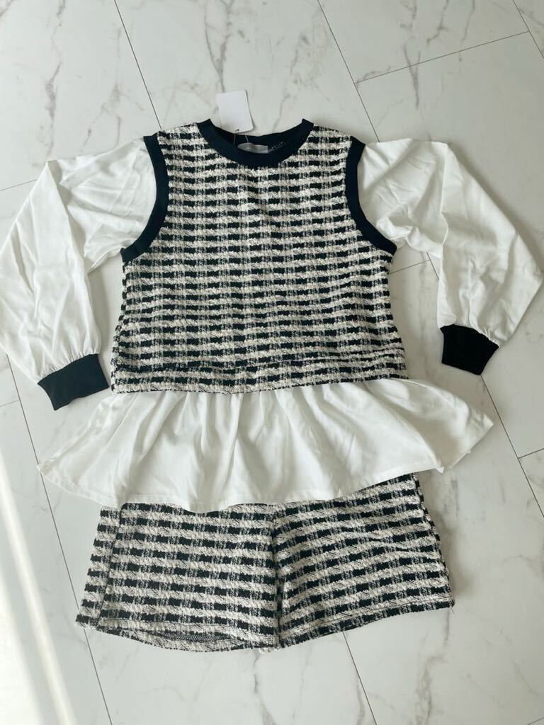 この白と黒のチェック柄のツイード風生地を使用したセットアップは、トレンド感満載のデザインです。長袖トップスとショートパンツがセットになっており、特別な日やカジュアルな外出にぴったりです。