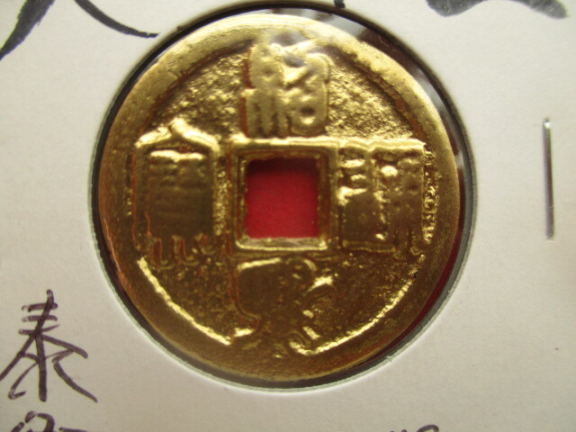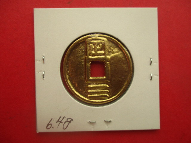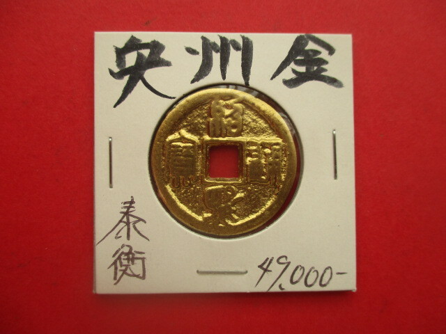 平安時代末期に現在の東北地方全域を支配していた奥州藤原氏が鋳造したと伝えられる金貨です。皇朝十二銭以来、貨幣の鋳造を見送り、もっぱら中国からの渡来銭に頼ってきた日本ですが、中央から離れた場所、しかも広大な地域で独自の文化を誇り、絢爛豪華な中尊寺金色堂を建立した一族が貨幣(金貨)の発行を試みたは不自然ことではありません。詳しい方のご意見では古代中国貨幣のデザインを借用しているとのことです。こちらは四代藤原泰衡公の時代に鋳造されました。