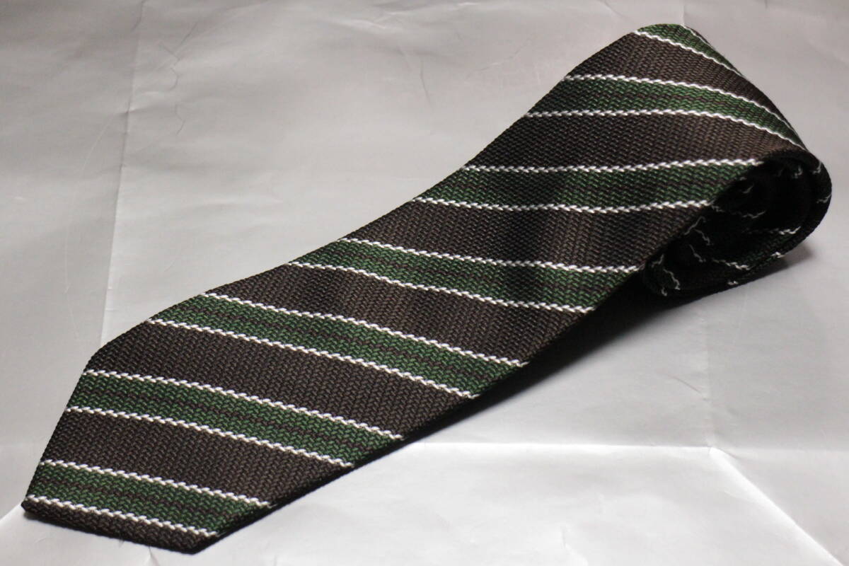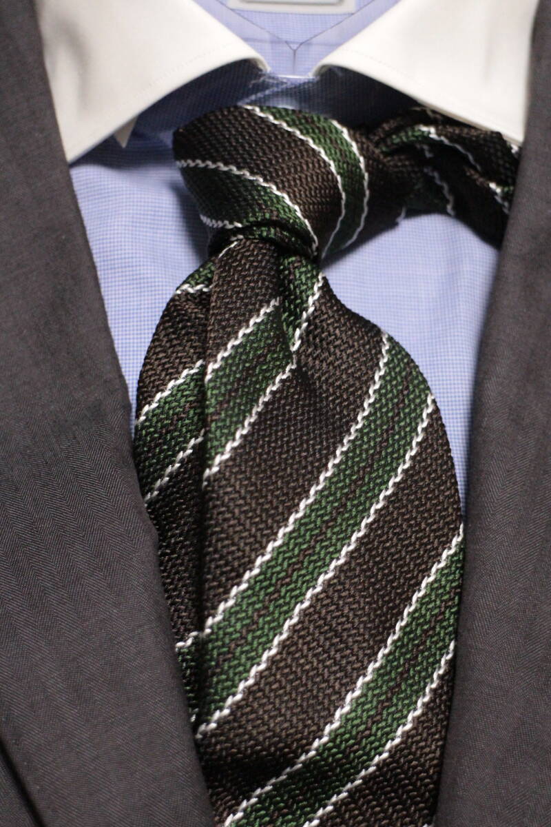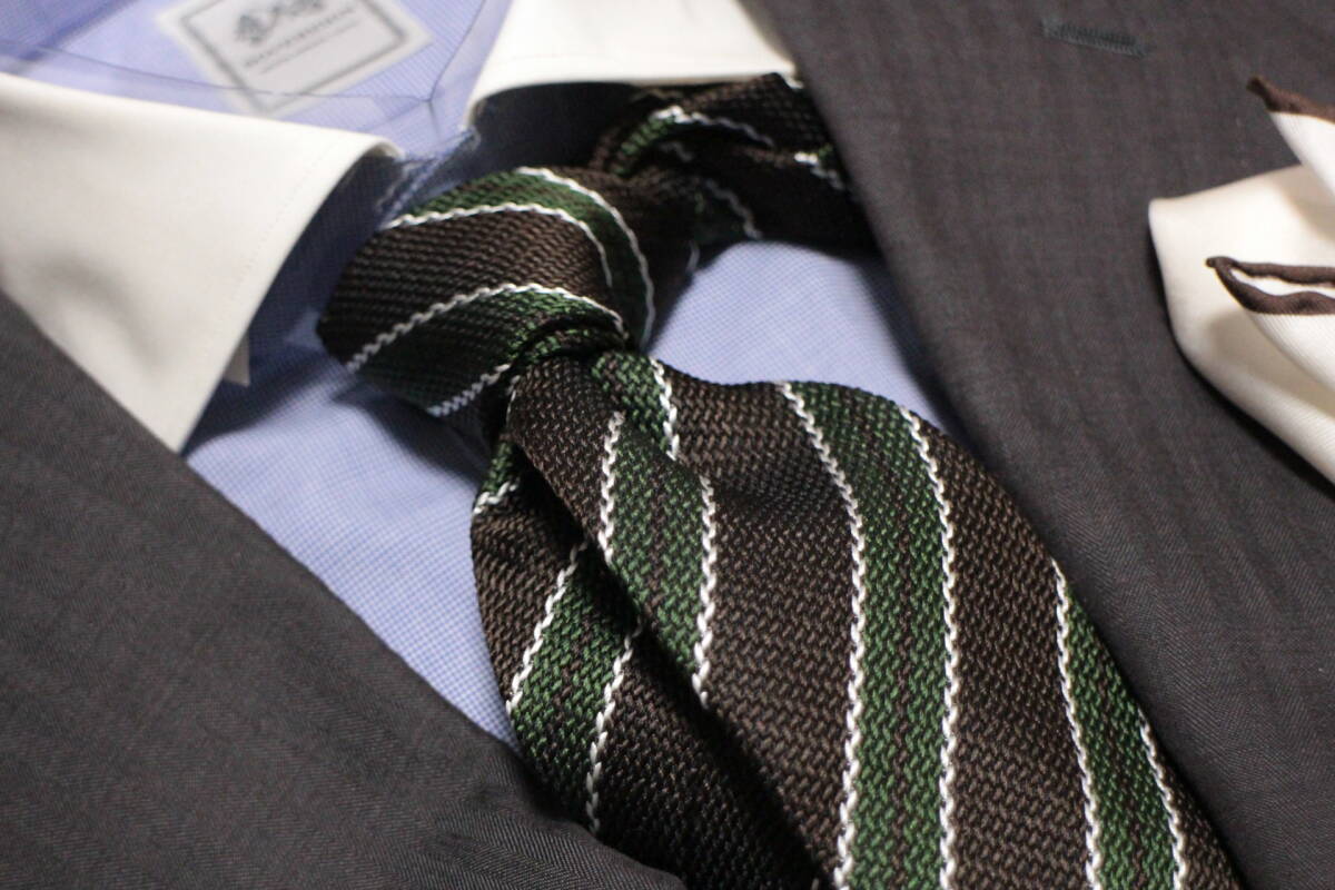 レジメンタルタイ。ブラウンとグリーン、上品なアースカラーの組合せに、シックなブラックを