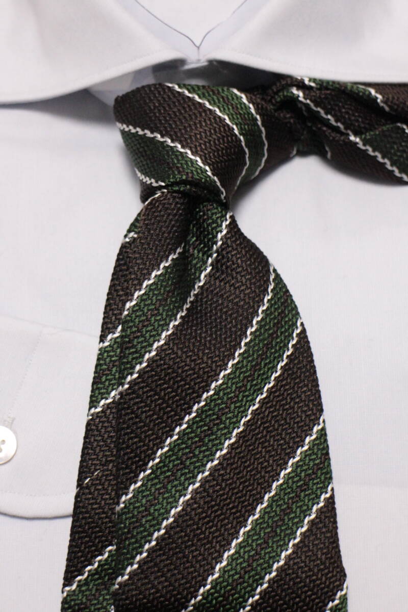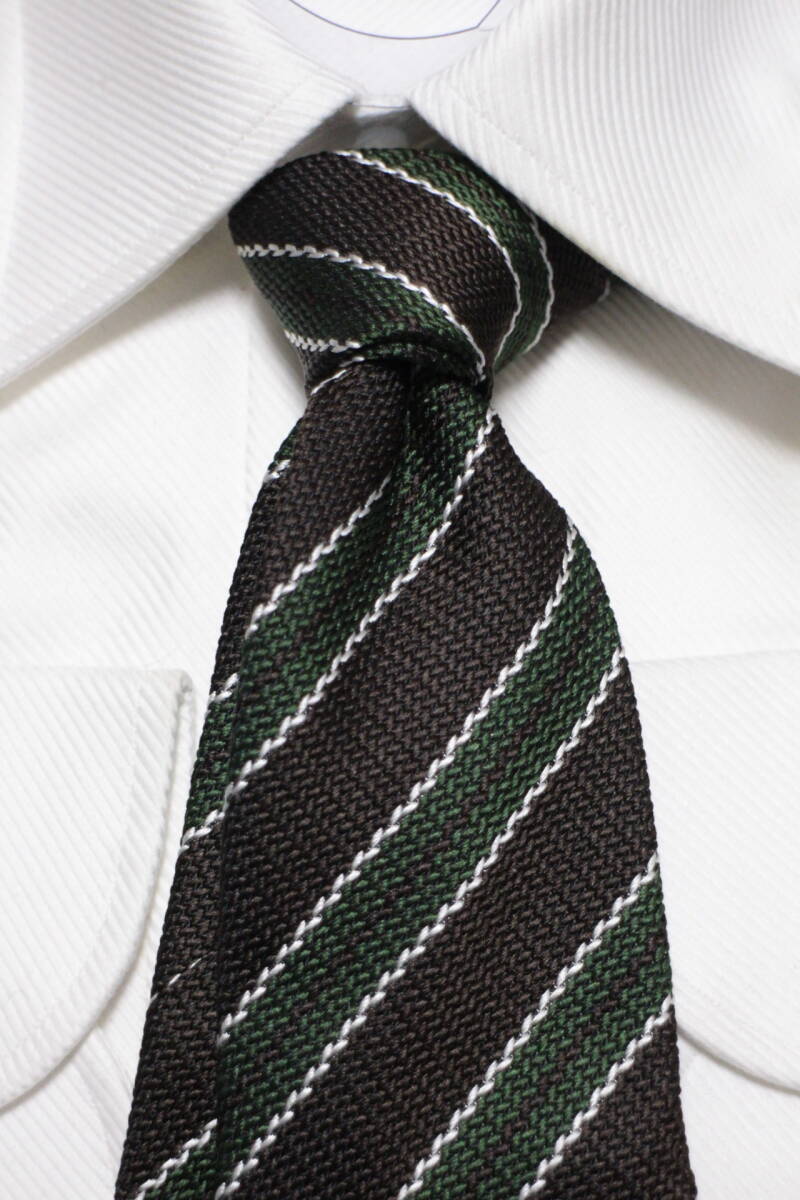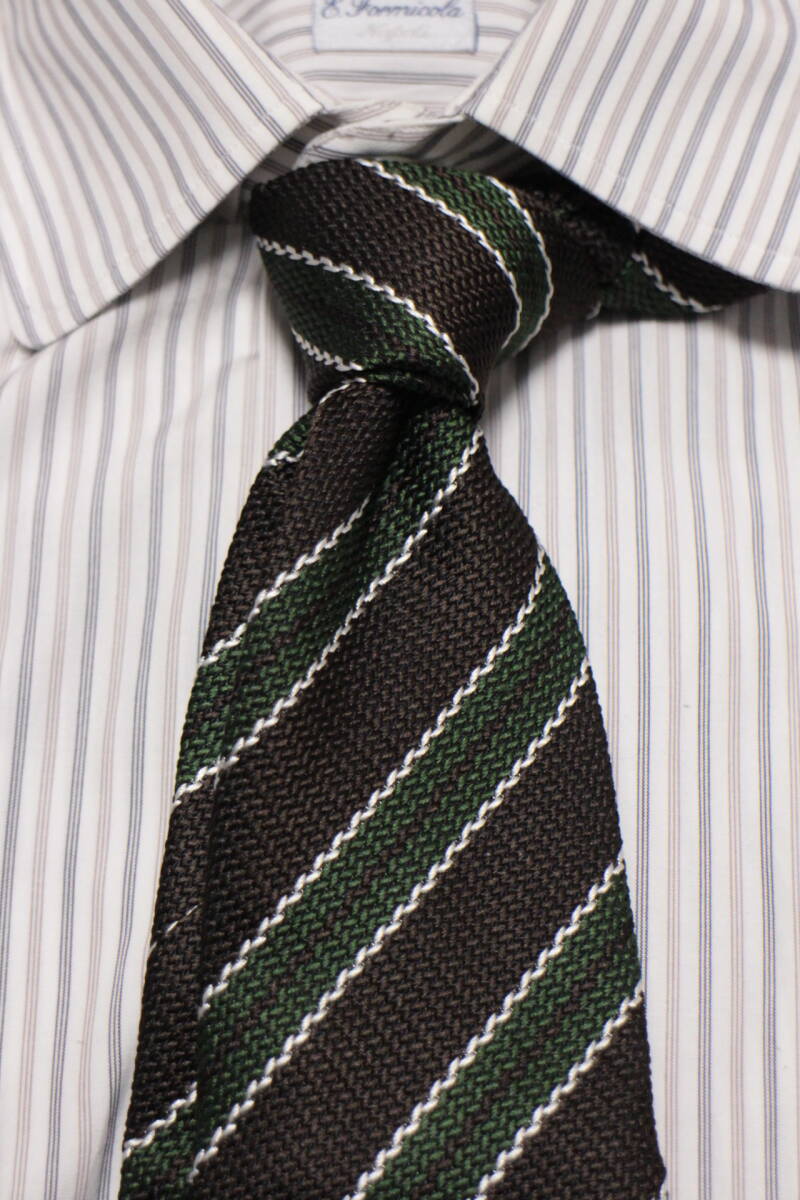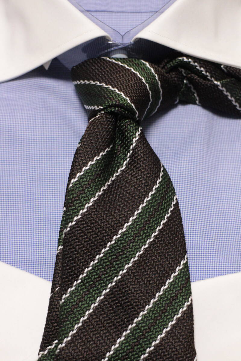 レジメンタルタイ。ブラウンとグリーン、上品なアースカラーの組合せに、シックなブラックを