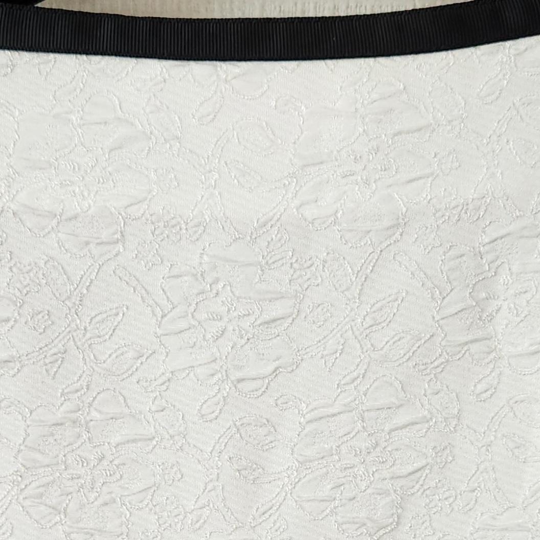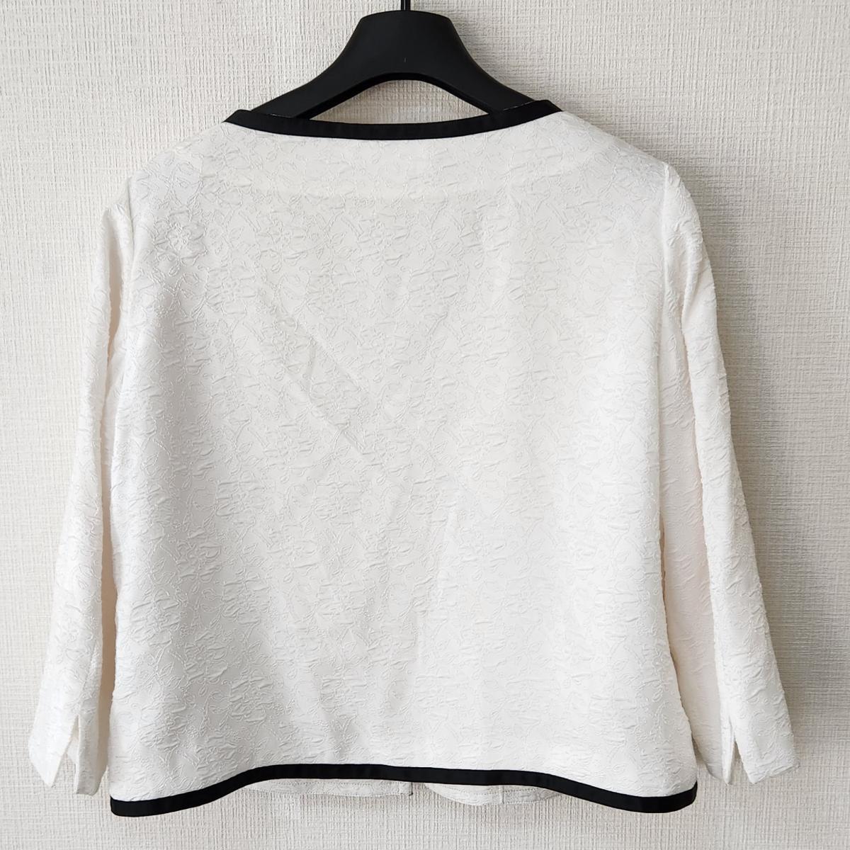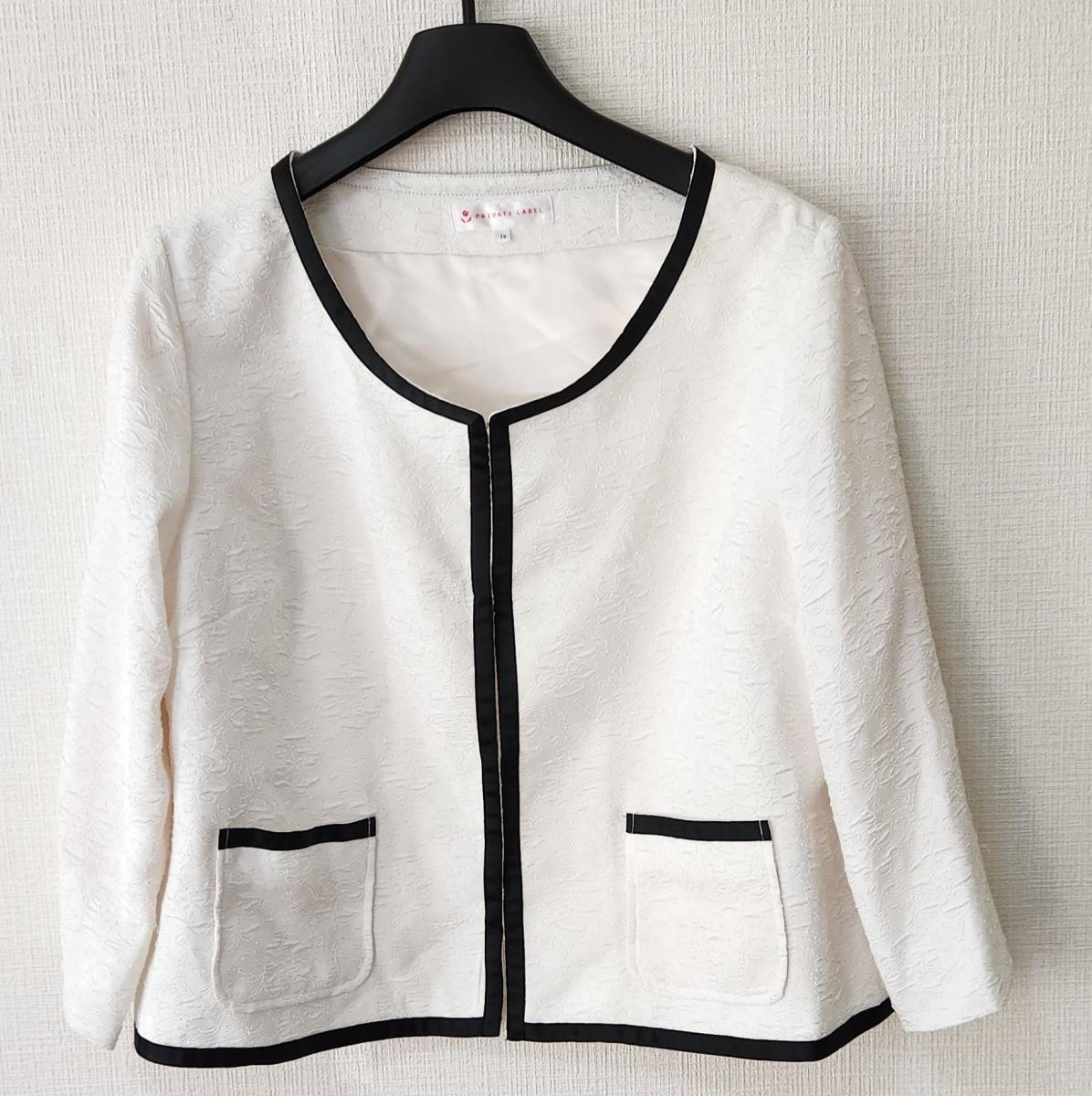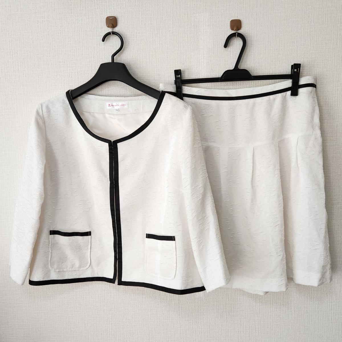 ホワイトとブラックのコントラストがステキなノーカラージャケットとスカートの2点セットです