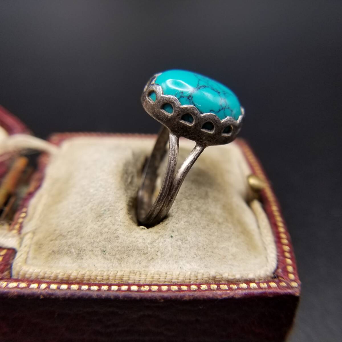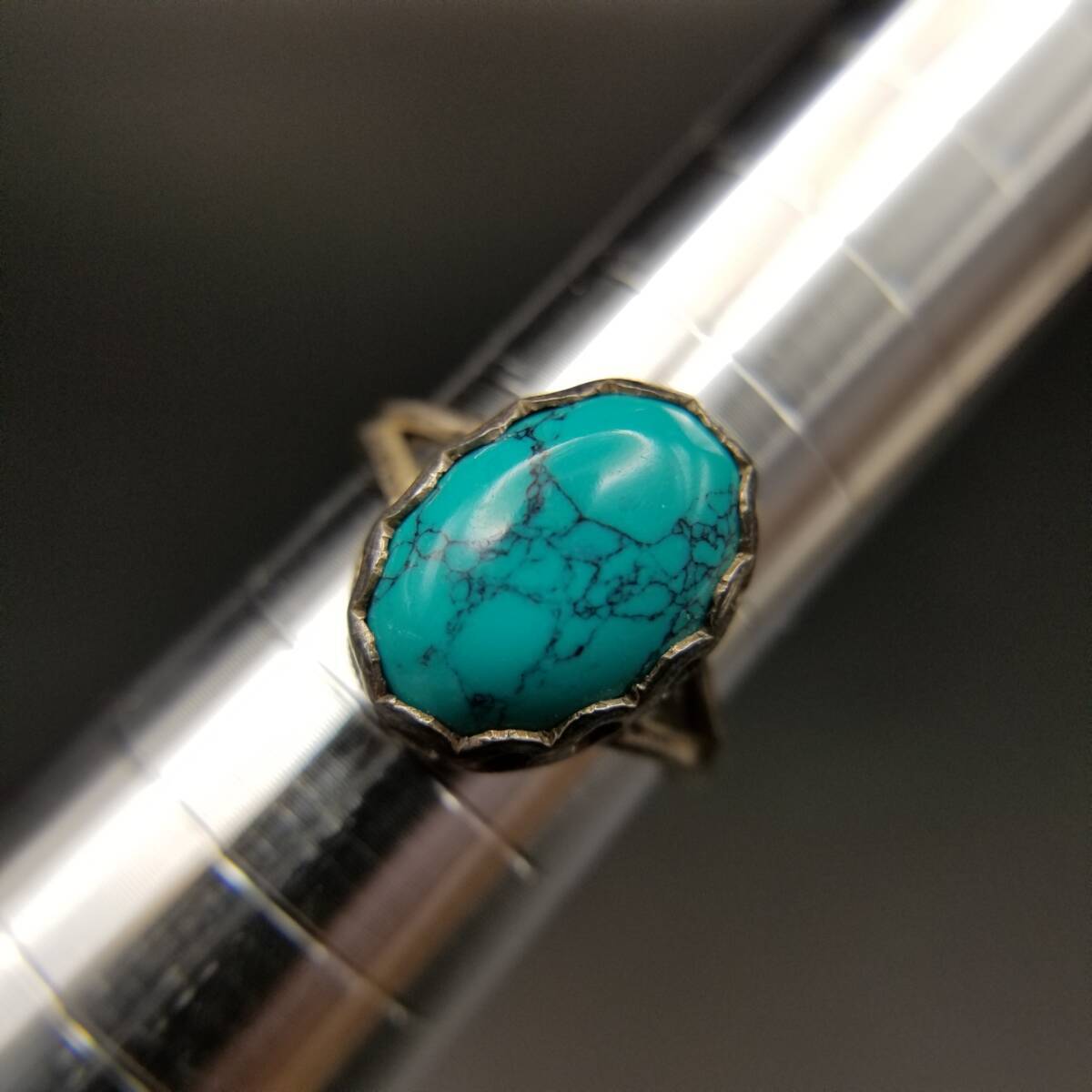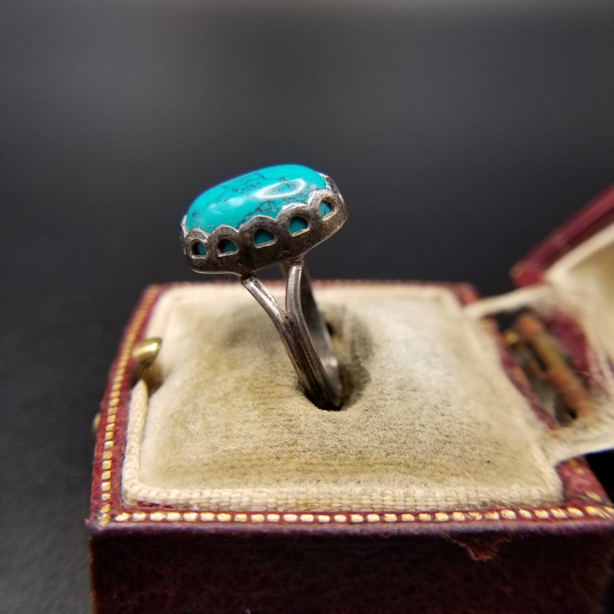 NAG ターコイズ オーバル カボション 925 シルバー ヴィンテージ リング レースリム 銀指輪 サウスウェスタンスタイル 鮮やかな色 R14-G