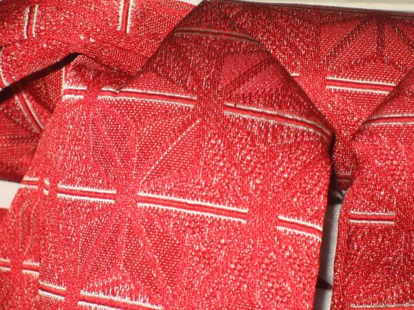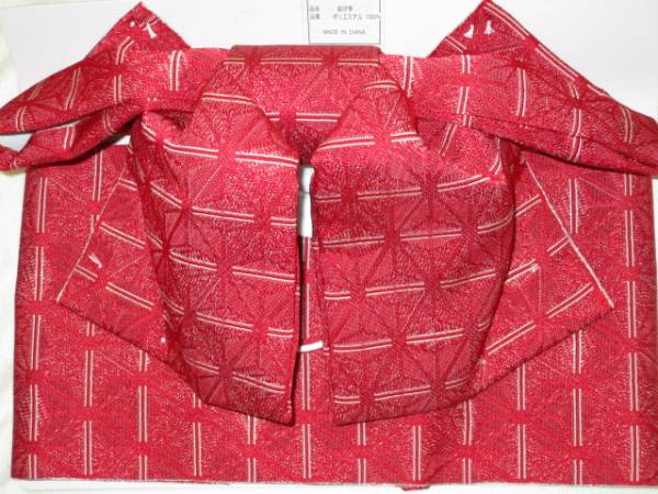 女性浴衣用、地紋柄結び帯  臙脂色  ポリエステル  新品(織り地紋柄ありです。波状の写りはレンズの光学的ないたずらで現品にはありません、また薄く濃く写っている場合もあります)、胴部--帯巾約16,5cmx長さ約130cm、リボン部は横に約30cm。見た範囲で汚れないと思いますので、着用には問題ないと思います、。なお処分特価で出品です。