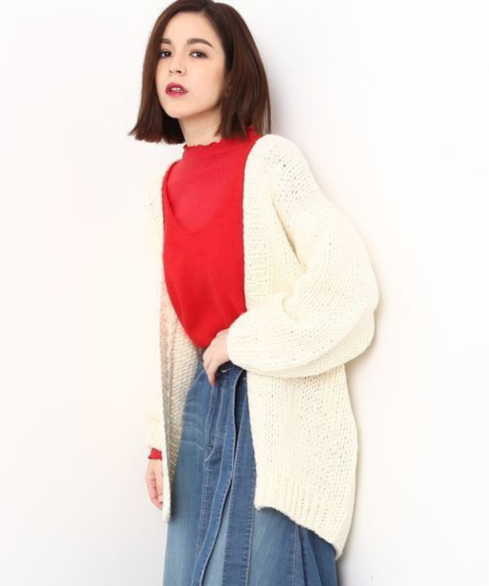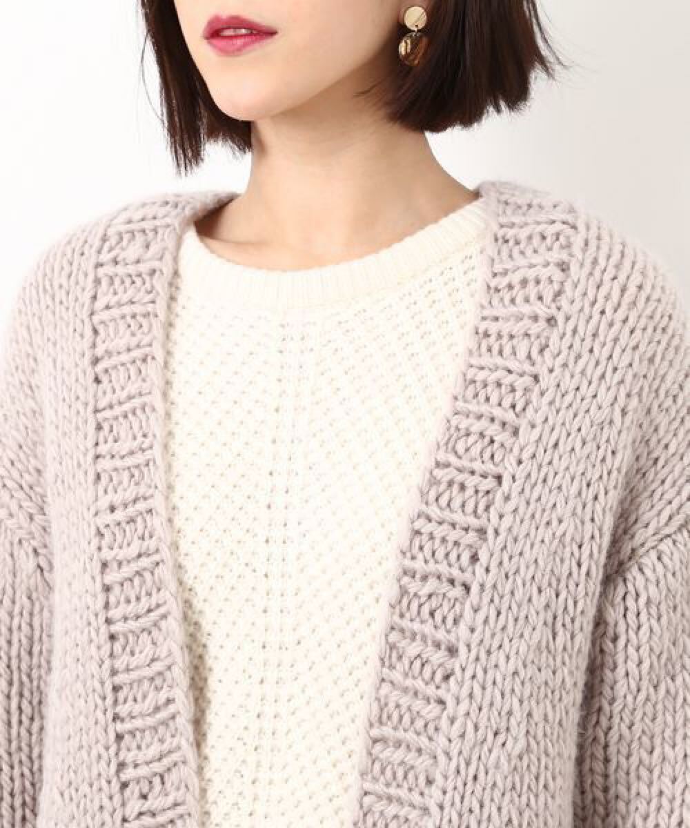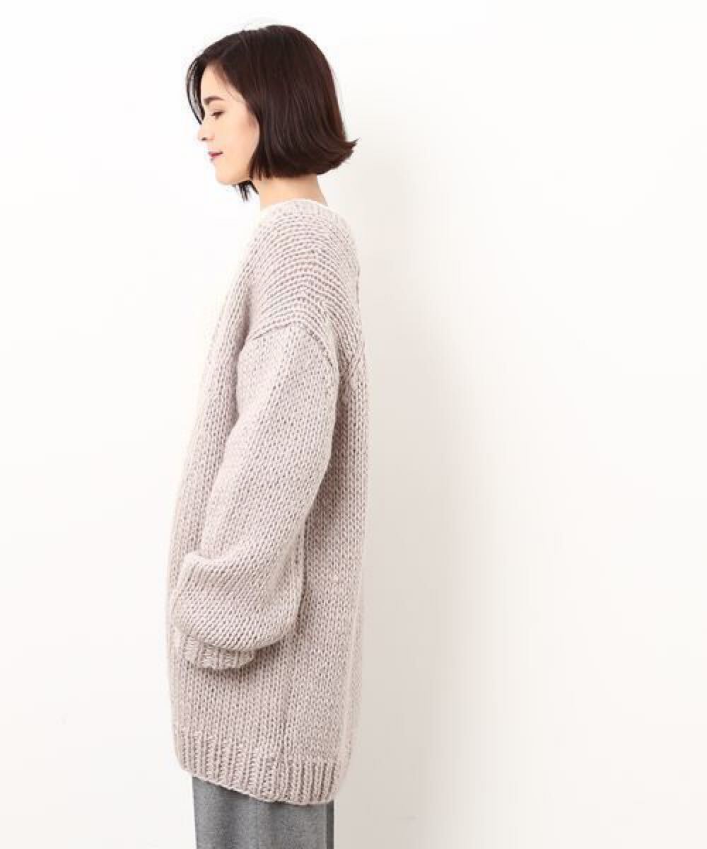 ルーズなシルエットが今年一押しのミドル丈ニットカーディガンが登場!ざっくりと編み込まれた肉厚の素材で、ロービングヤーンという甘く撚りをかけた糸を使用したハンドニット。軽い羽織りとしてももちろん、アウターの中に着こんでも暖かくお過ごしいただけます。手編み独特に雰囲気があり、とても上品にカジュアルダウンできる羽織りの1枚。デニムはもちろん、キレイ目のボトムにも合わせやすい上品な糸使いです。冬ならではのボリュームある一着です。
