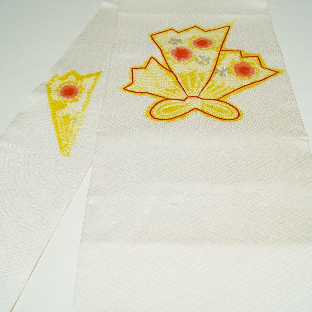 商品 説明 | 紗綾型地紋の入った乳白色系の地に扇に刺繍の梅花、絞りの小花模様が施された名古屋帯です。 |