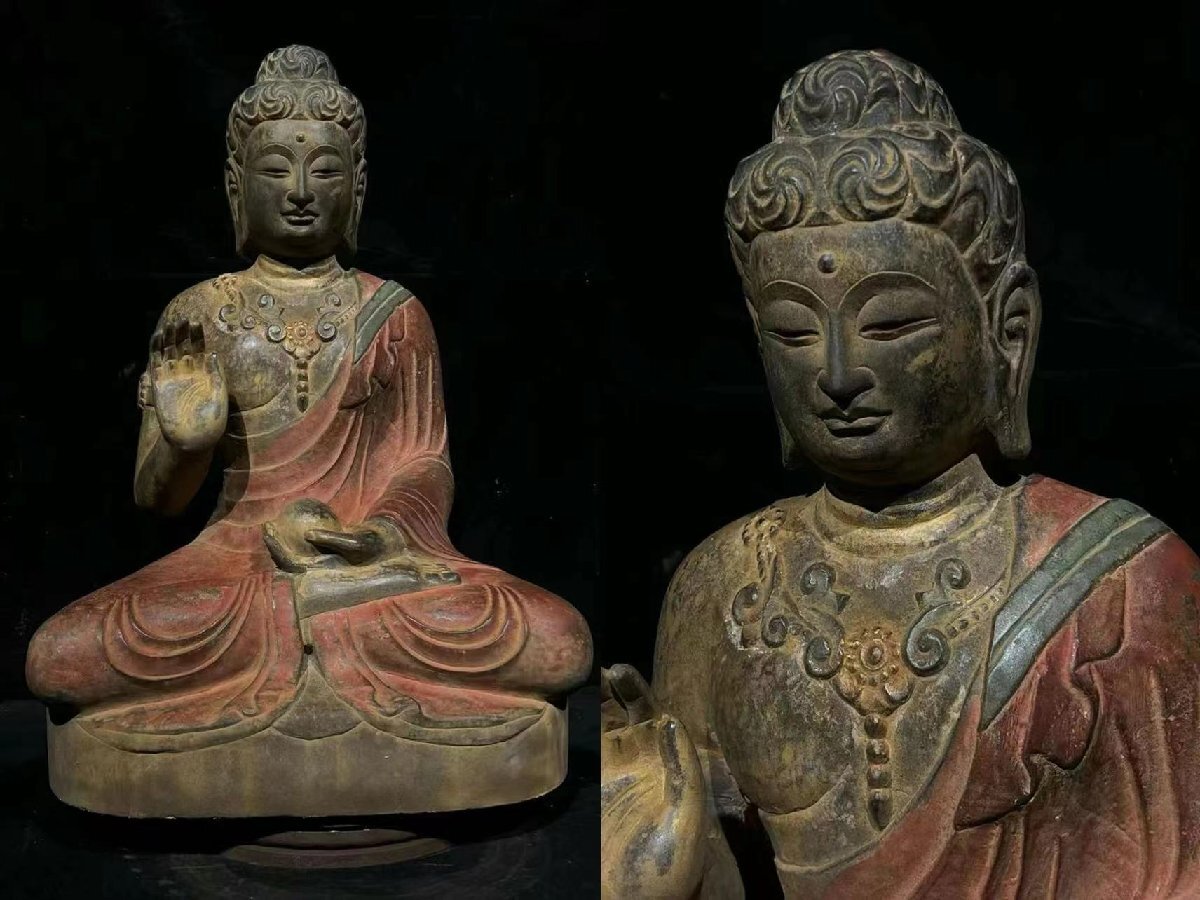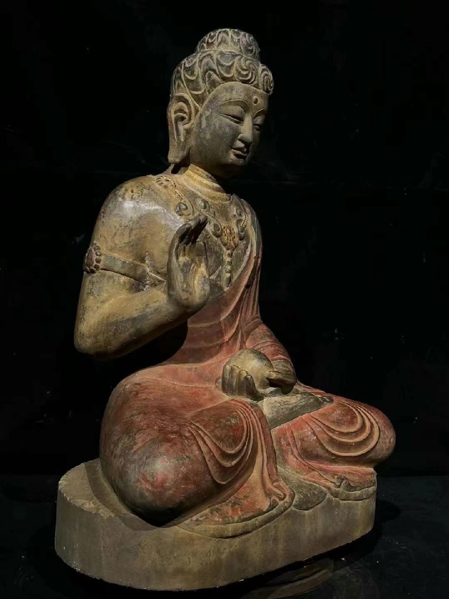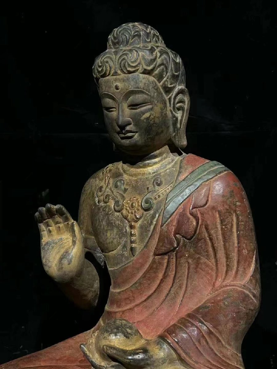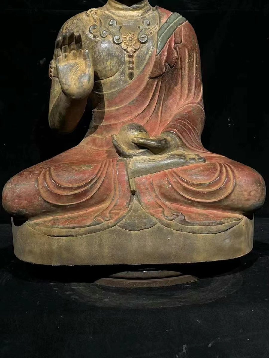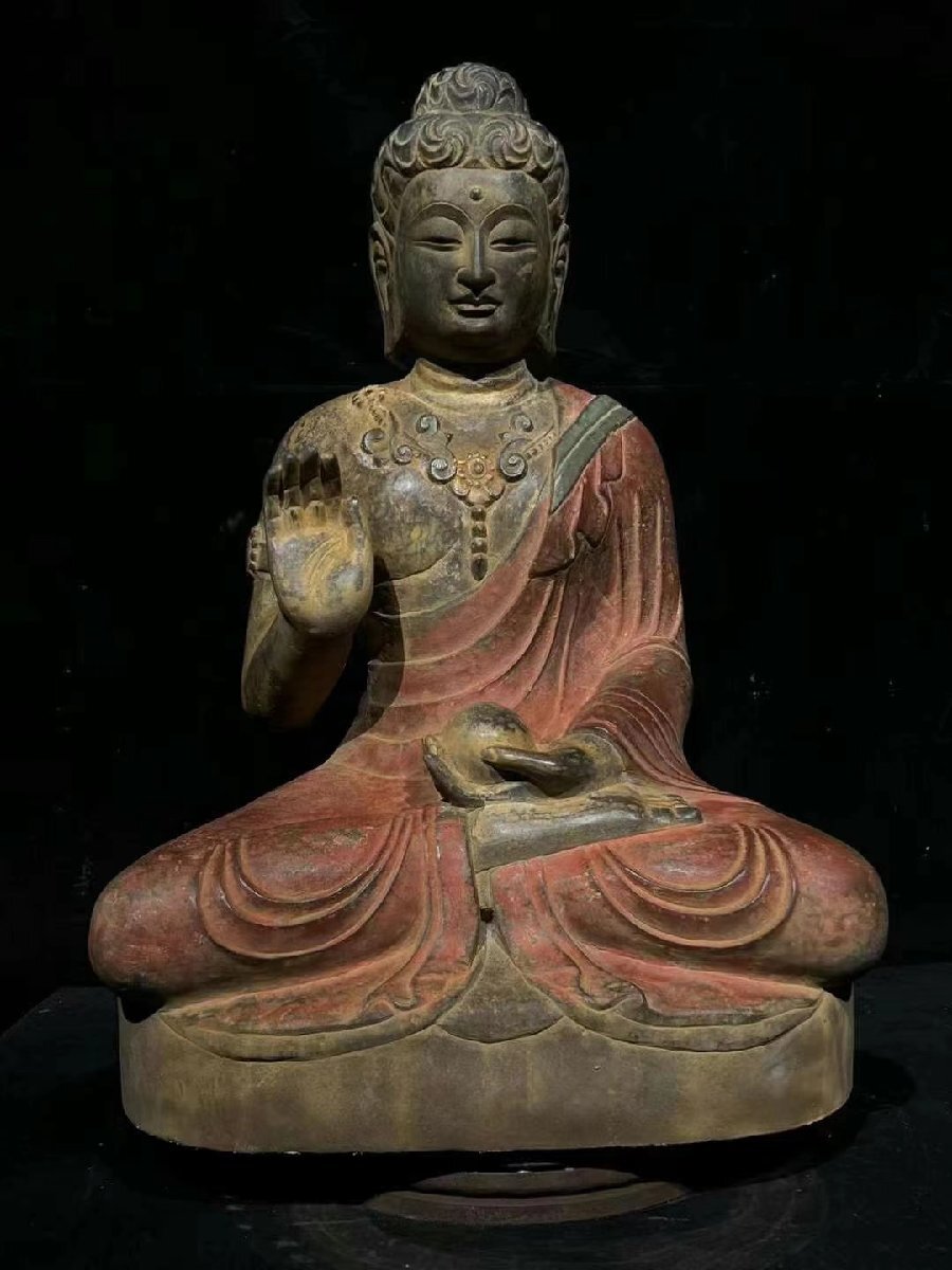 ■観心・時代旧蔵■B419北魏時代 青石彩絵仏坐像 青石細工彫刻★仏教古美術★仏像★廃寺買出品 高さ60cm横幅39cm奥行き27cm