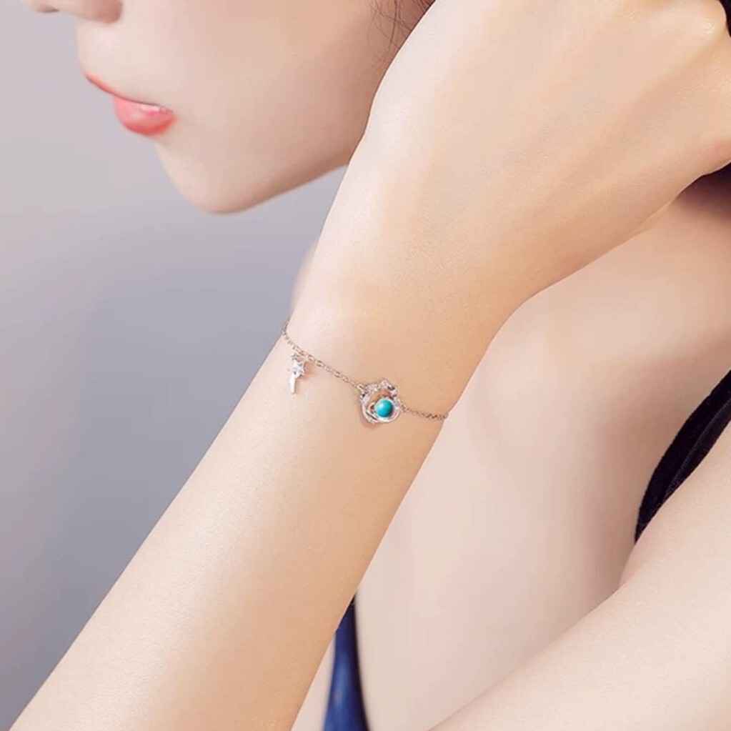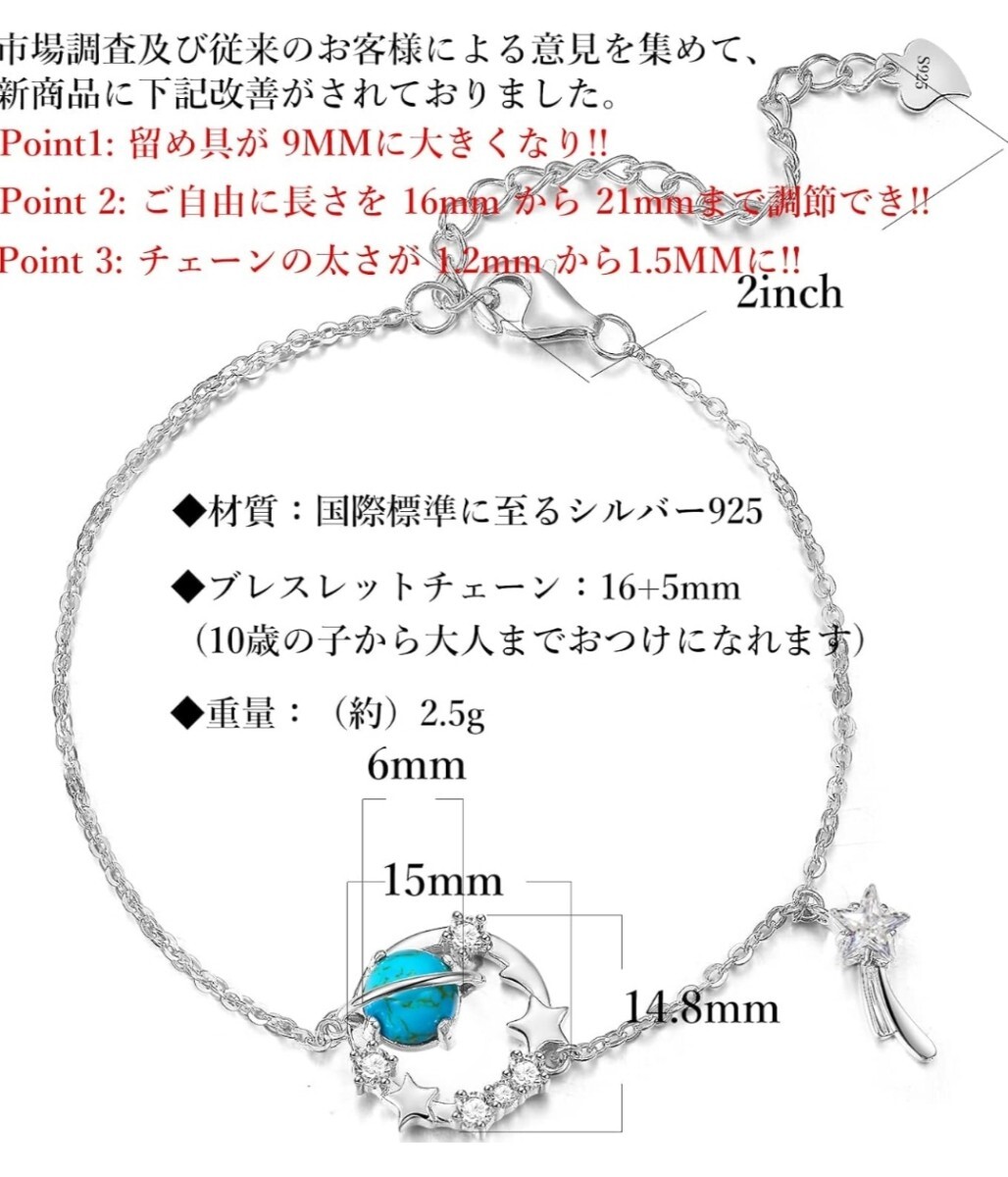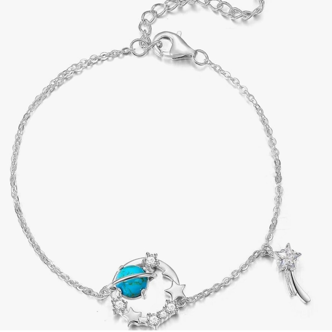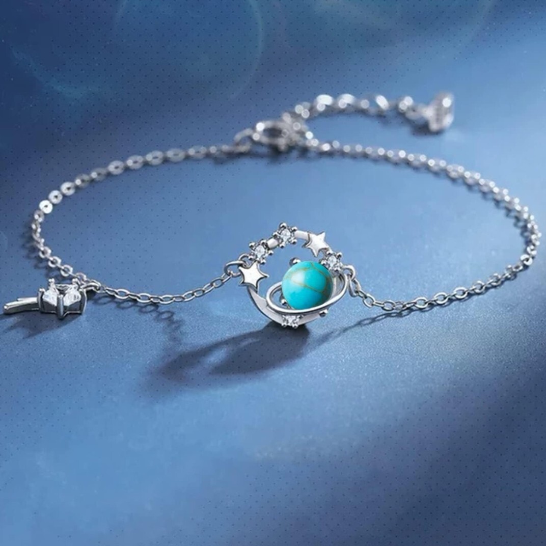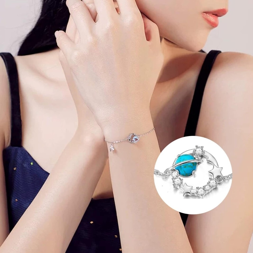 【惑星をモチーフにしているデザイン】お好きな人と宇宙を自由に旅するという理念を入れており、惑星シリーズが登場しました。夜空にきらきらに輝いているスター、ムーン、流星、惑星、どちらでも宇宙の魅力を話していますでしょう。目立っているターコイズ誕生石を飾り付けているブレスレットを腕元につけると、ユニークで可愛らしくも大人っぽさも秘めたジュエリーアクセサリーです。