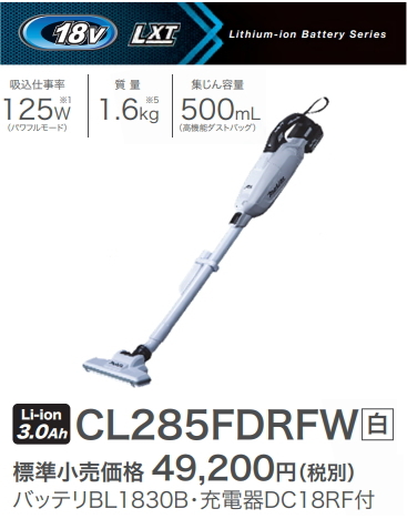 マキタ 充電式クリーナ CL285FDRFW 白【18V-3.0Ah】