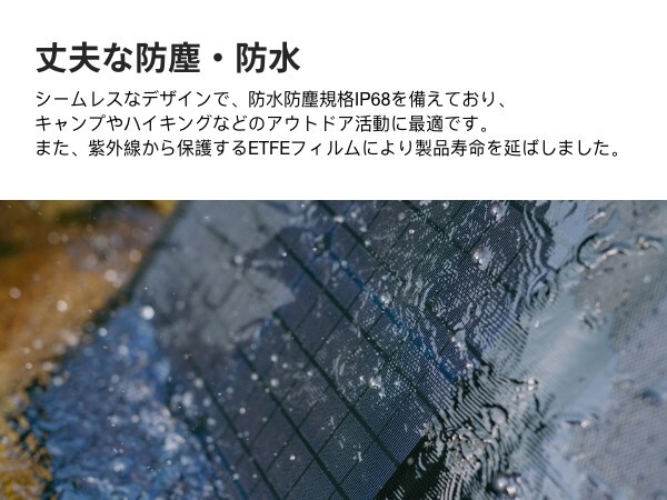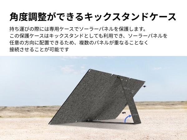 キャンプからアウトドアでの使用において、パネルを広げて設置するのはあっという間です。また、ソーラーパネルを0〜180度の角度に調整できます。従来のモデルと比べると、パネル単板の面積が31.43%増加、出力が37%増加(ソーラーパネルのエネルギー変換効率は22%から23%へ)