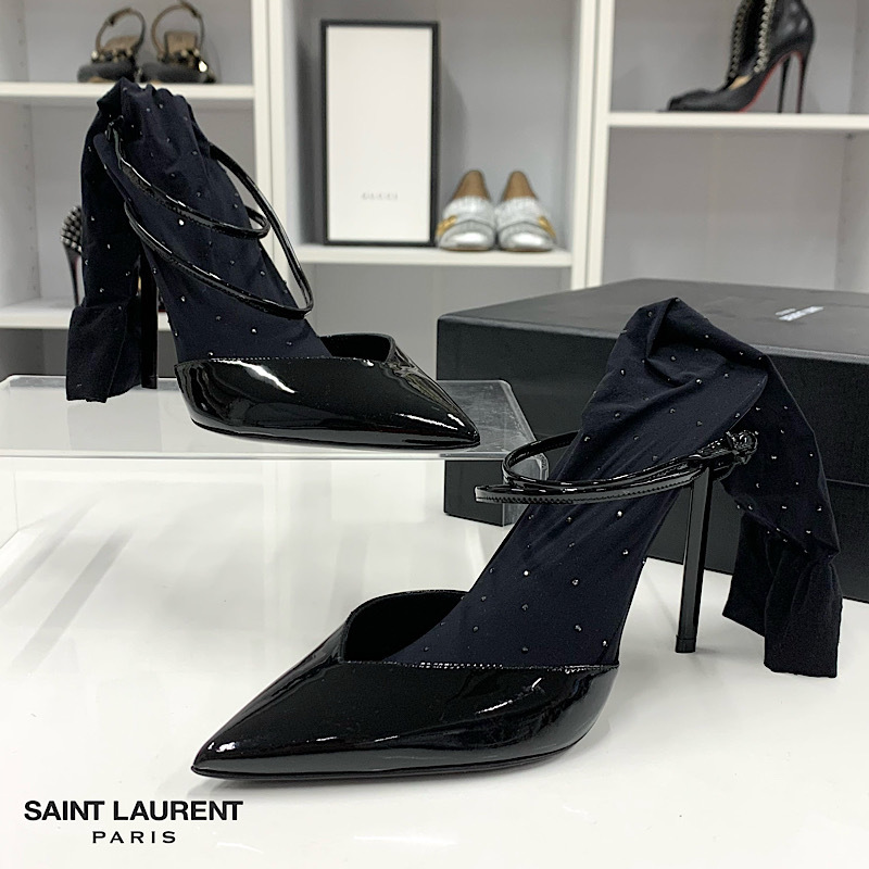 サンローランのラインストーンが付いたソックス付きのパンプスです。ワンピースやドレスなどに合わせたらすごく上品でオシャレな印象になります