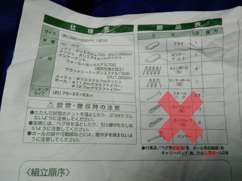 状態は使用品となり、擦り傷・汚れ・使用による臭い・ 防水テープの浮きなどあります。 インナーテントは一部テープが外れています。 フライシートに多少色写り・ロゴの塗装剥がれがあります。 袋に取扱説明書あり。付属品は画像8枚目の×印が欠品しています。 |