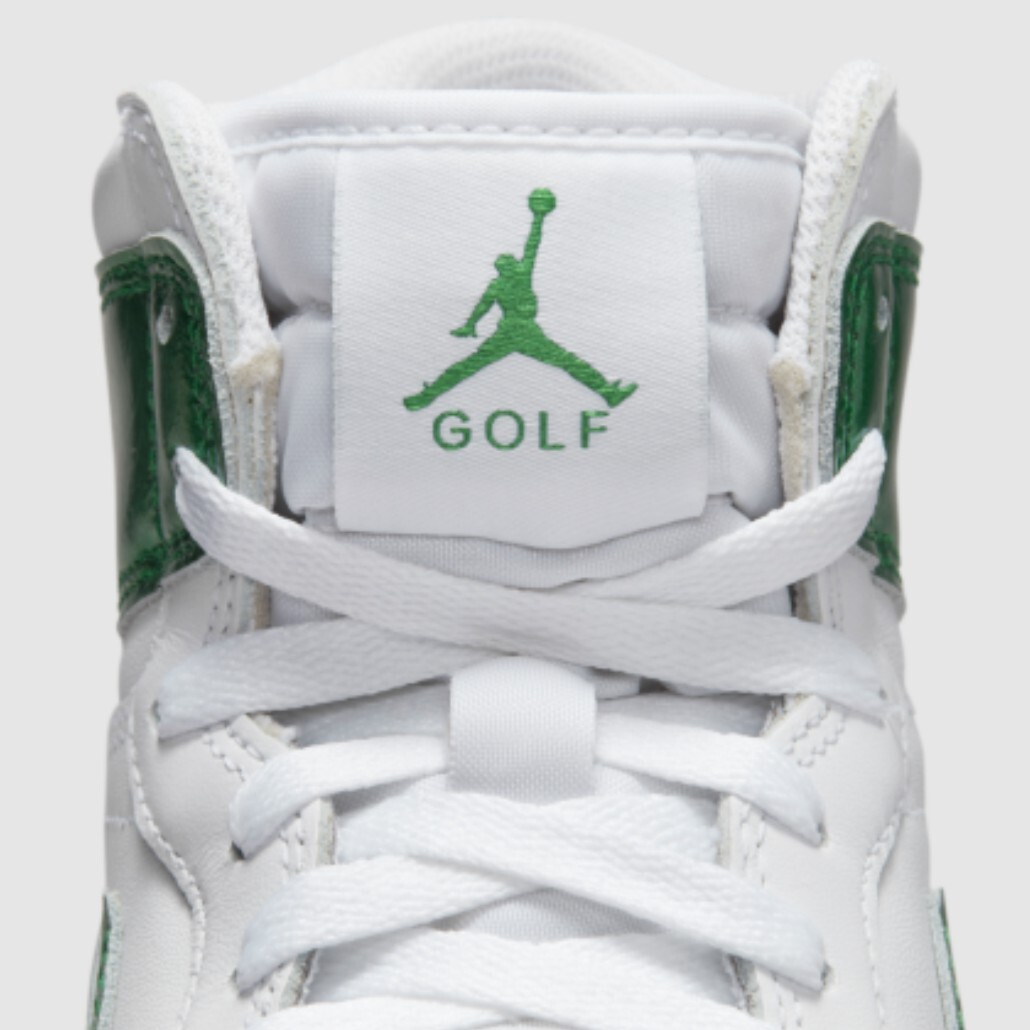 今作はエアジョーダン1をゴルフ仕様した「エアジョーダン1 ゴルフ」をベースにした新色。クリーンなホワイトとメタリックグリーンの鮮やかなコントラストが美しいバイカラーとなり、「Air Jordan 1 Retro High "Do The Right thing"」を彷彿とさせる一足に仕上がっている。