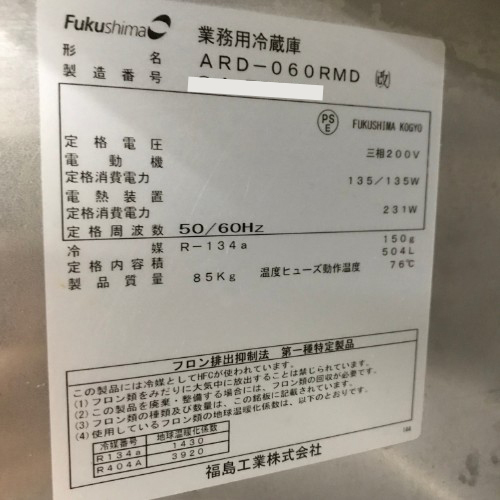 【業界最長1年保証】縦型冷蔵庫 フクシマガリレイ(福島工業) ARD-060RMD 業務用 中古/送料別途見積