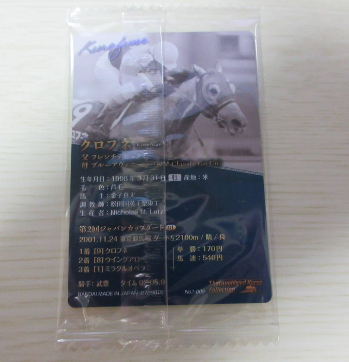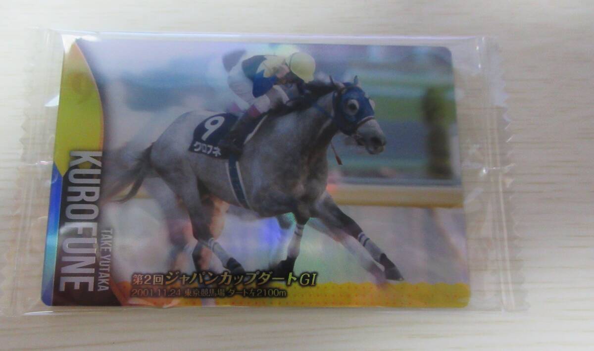 サラブレットホースコレクションツインウエハース【クロフネ】【武豊騎手】2001年 ジャパンカップダートになります。カードは内袋未開封新品になります。発送はプラ製カードに入れて、水濡れ対策をして定型郵便で110円になります。ノークレームノーリターンでお願いします。