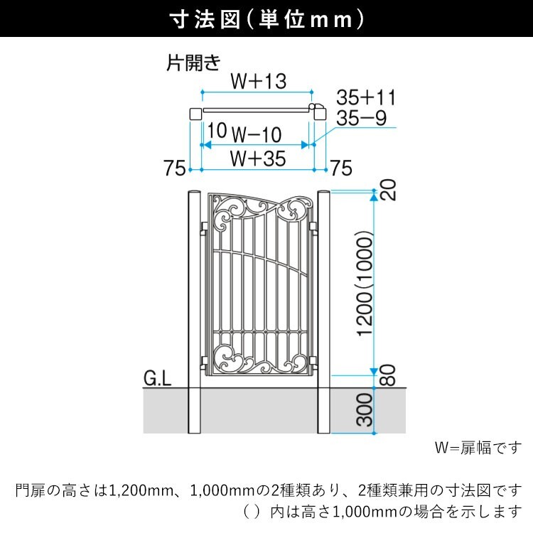 | 有料オプション | ・外開きひじ金具<片開き用>はこちら 扉の開閉方向:外開き(道路側へ開く)仕様に するための外開きヒジ金具セット ・門扉ストッパー<サイズは2種類> 扉を開いた際の障害物との接触防止や、 大きく開いた際に丁版ボルトカバーと、ヒジ金具の干渉を抑制します ●高さ10cmはこちら● ●高さ15cmはこちら● | |