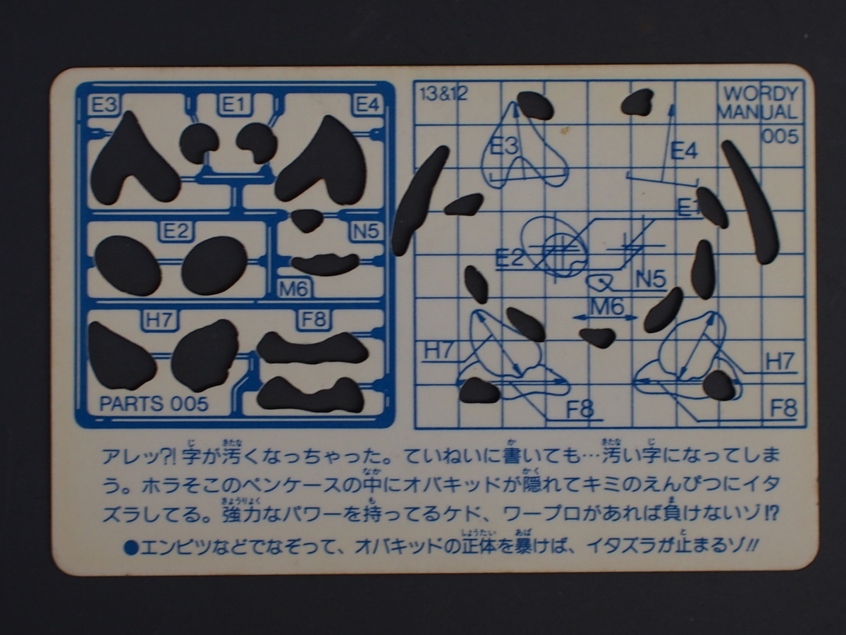| 商品説明・コメント | 超マイナーカード、カネボウ食品の君はオバキッドをみたか?!のカードです。 「君のまわりにオバキッドはひそんでる。」のキャッチフレーズでカネボウ食品から発売された妙なカードです。 最近、身のまわりにおかしなことがよく起こっているキミ、それは、オバキッドのイタズラのせいなんだ。 彼らの正体を見つけ出し、イタズラをやめさせて、楽しくいこうぜ!! と言った触れ込みでカードの空洞を鉛筆等でなぞるとオバキッドの正体が暴けてイタズラが止まるとの実にくだらないカードでは御座いましたが流石に不人気で実存数も減ってきたカードです。 出品物は前述の通り、穴をなぞりオバキッドの正体を暴いた跡は御座いませんのでご安心下さいませ。 カードブームの中の最後発のカードに位置し一部では人気でしたがコレクションカードとしての知名度は低く、現存数は中々残っていないのが現状のマイナーカードです。 依って必然的にコンプリートがかなり困難なカードシリーズでもあります。 当時物なので状態は年式相応にはなりますがコレクションして頂くには充分だと思われます。 前述の通り、現存も少なくなり中々市場に現れる事が無くなって来ましたのでマニア必見です。 商品の仕様の詳しくは御自身でお調べ頂きます様にお願い致します。 古いカードになりますので全てに於いてオリジナルを保証する物では御座いません。 状態に尽きましては写真にて御確認頂けます様御願い致します。 写真では御確認頂けない不具合等もある前提で原則ジャンク扱いにて御考慮下さい。 上記の通り、原則瑕疵担保責任はお受け致しませんので御了承下さいます様御願い致します。 上記の条件を御理解頂けない方の入札はお断り致します。 |
