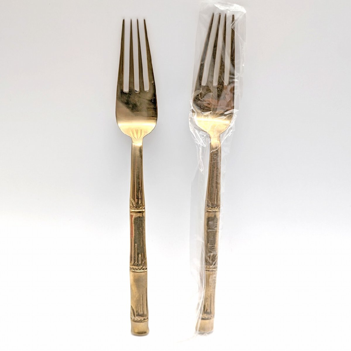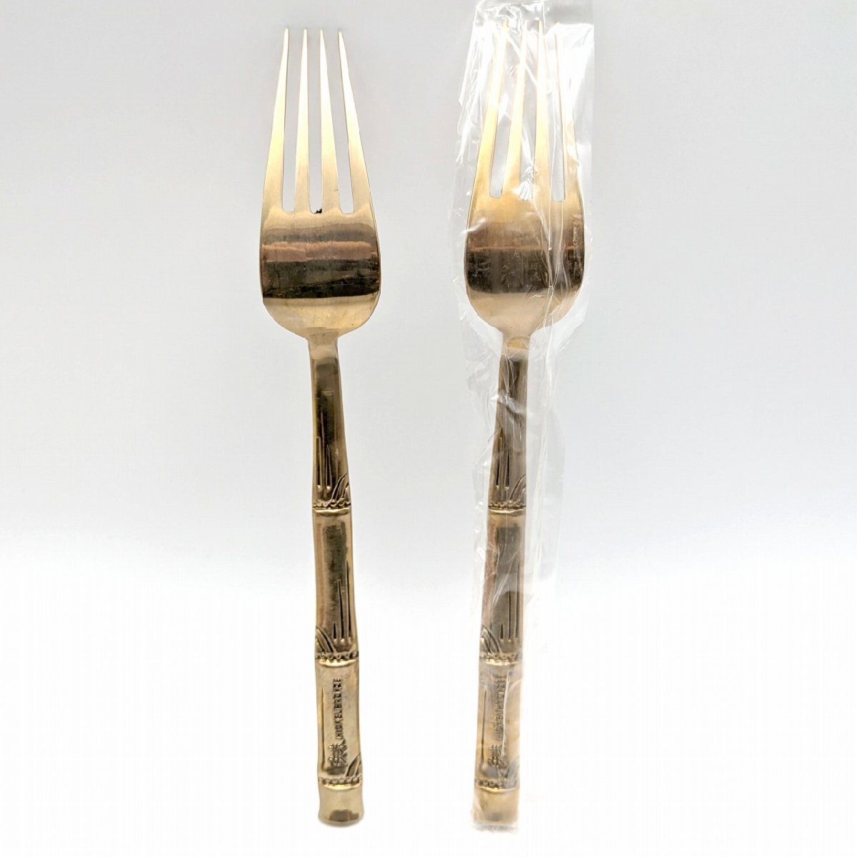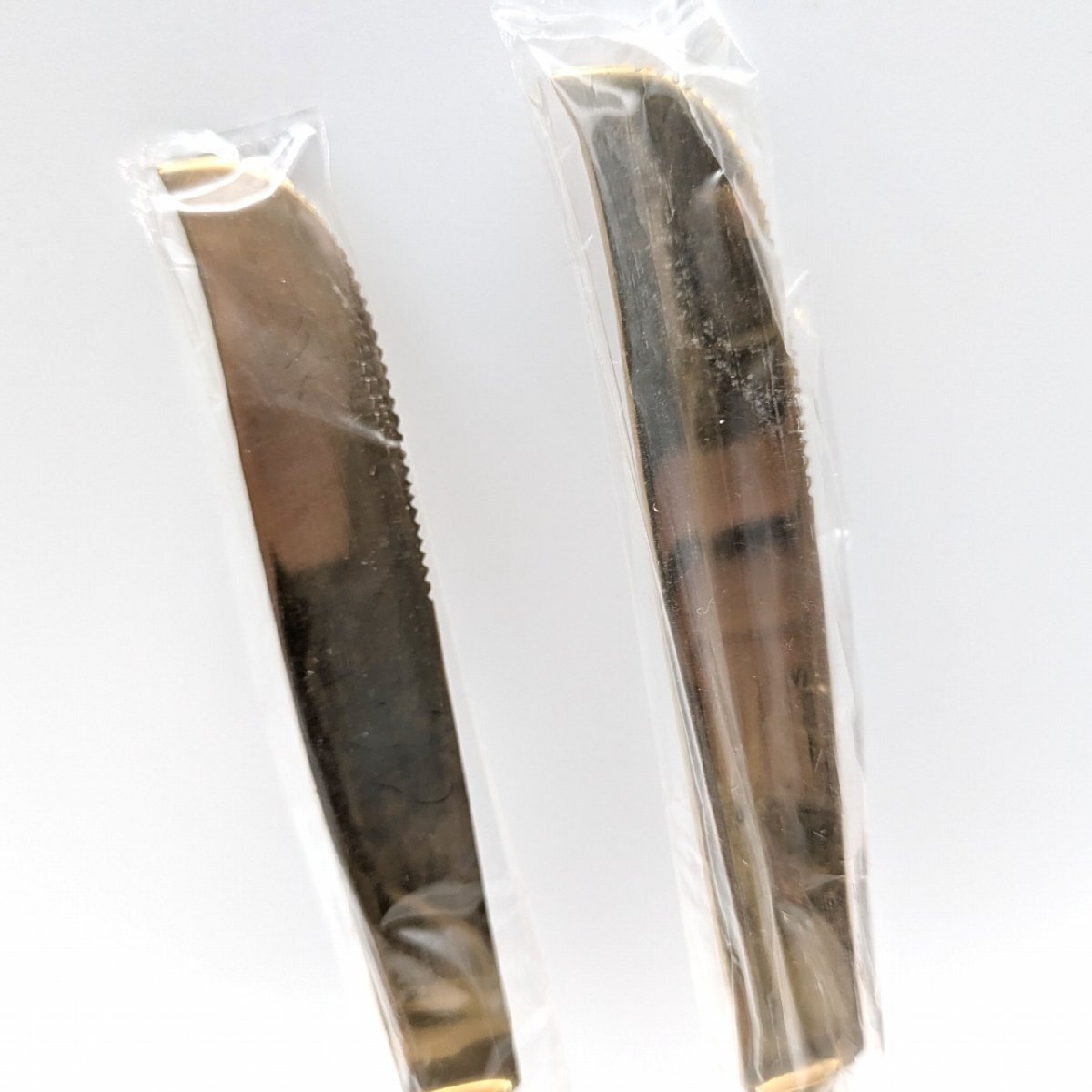 フォーク:約195㎜×2本、ナイフ:約200㎜×2本、計4本セット、状態ランク:C 商品は画像に写っているものが全てです。フォークのうち1本はビニールから取り出されています。他3本は未開封ですが若干の経年劣化が見受けられます。その他状態は画像をご確認ください。