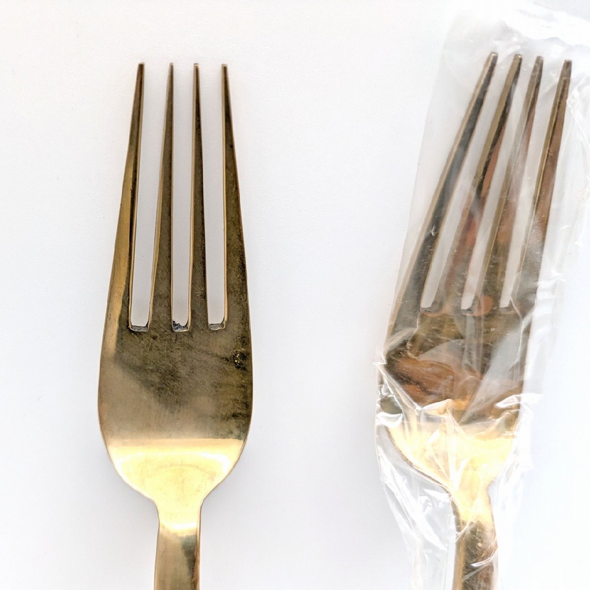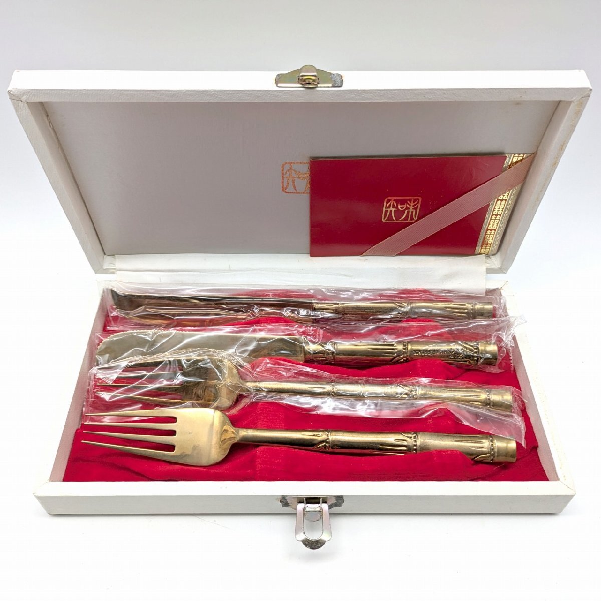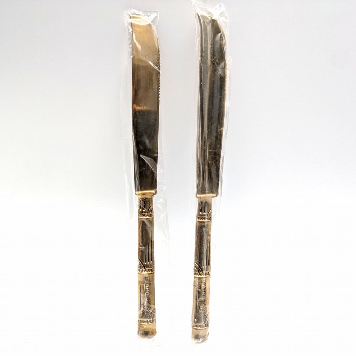 フォーク:約195㎜×2本、ナイフ:約200㎜×2本、計4本セット、状態ランク:C 商品は画像に写っているものが全てです。フォークのうち1本はビニールから取り出されています。他3本は未開封ですが若干の経年劣化が見受けられます。その他状態は画像をご確認ください。
